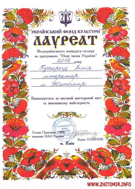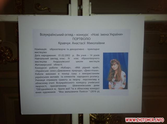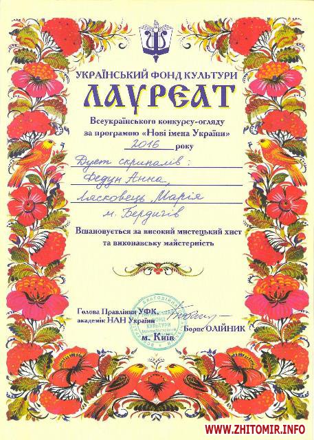 «Щорічно в місті Києві у Всеукраїнському огляді-конкурсі за програмою Українського фонду культури «Нові імена України» можуть брати участь юні та молоді таланти від 6 до 18 років, які пройшли регіональні та обласні тури. В цьому році у Всеукраїнському огляді-конкурсі взяли участь біля 140 учасників з різних областей України, з них 48 стали лауреатами. Конкурс проходив два дні: 22 листопада та 23 листопада 2016 року, церемонія нагородження відбулася 24 листопада 2016 року о 14.00 в Золотій залі Українського Фонду культури. Житомирську область у м.Києві представили переможці обласного етапу, які стали лауреатами та дипломантом 29-го Всеукраїнського огляду-конкурсу «Нові імена України – 2016», - інформує обласне управління культури.