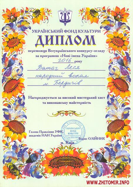 Диплом в номінації «Народний вокал» отримала Ватаг Леся, 2003 р.н. - учениця Бердичівської музичної школи, викладач Бузі І.В., концертмейстер Щебетюк Н.Ф.