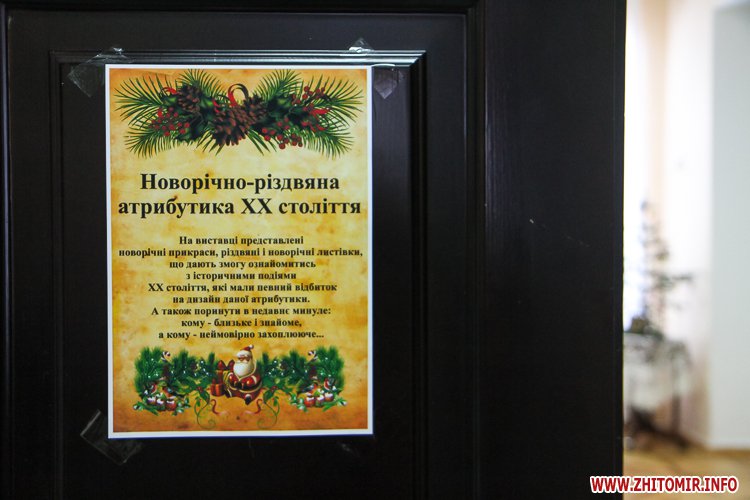 У Житомирському краєзнавчому музеї 16 грудня відкрили виставку раритетних святкових прикрас та листівок «Новорічно-різдвяна атрибутика». Ініціаторами створення виставки стали представниця етнографічного відділу Надія Борисова та наукова співробітниця історичного відділу Ірина Ілінбаєва.