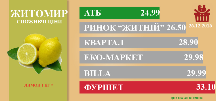 АТБ, пр. Миру, 15 А, Ринок "Житній", майдан Житній ринок, Фуршет, вул. Вітрука, 9 а, ЕКО-маркет, вул. Мала Бердичівська, 2/7, Billa, пр. Миру, 15, Квартал, вул. Вітрука, 13.
