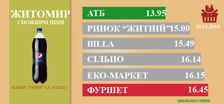 АТБ, пр. Миру, 15 А, Ринок "Житній", майдан Житній ринок, Фуршет, вул. Вітрука, 9 а, ЕКО-маркет, вул. Мала Бердичівська, 2/7, 1,Billa, пр. Миру, 15, Сільпо, майдан Житній ринок, 1.