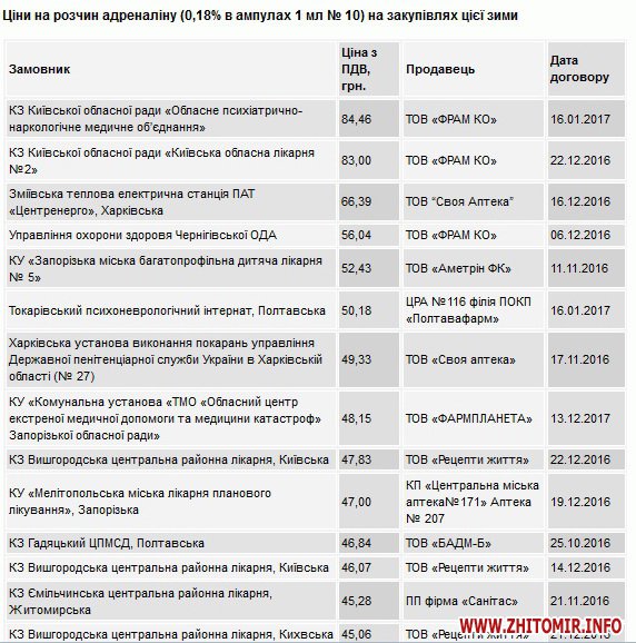 Сайт наводить ціни на розчин адреналіну (0,18% в ампулах 1 мл № 10) на закупівлях цієї зими. Так, КЗ «Ємільчинська центральна районна лікарня» 21 листопада купував адреналін у ПП фірма «Санітас» по 45,28 грн за упаковку, а 19 грудня у цієї ж фірми – по 40,25 грн за упаковку. Новоград-Волинське міськрайонне територіальне медичне об’єднання 8 грудня купило у ПП «Санітас» адреналін по 39,17 грн, а житомирська КУ «Центральна міська лікарня №1» 5 грудня у цієї ж фірми – по 37,02 грн за упаковку. КУ «Андрушівська центральна районна лікарня» 9 грудня закупила адреналін по 38,96 грн у ТОВ «БАДМ-Б», Житомирська районна лікарня 1 листопада купувала у ТОВ «Бадм» за 38,39 грн.