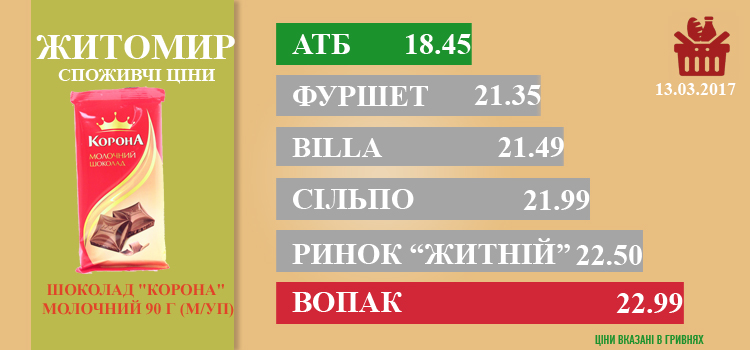 АТБ, пр. Миру, 15 А, Ринок "Житній", майдан Житній ринок, Фуршет, вул. Вітрука, 9 а,  Сільпо, майдан Житній ринок, 1,ЕКО-маркет, вул. Мала Бердичівська, 2/7, Billa, пр. Миру, 15.