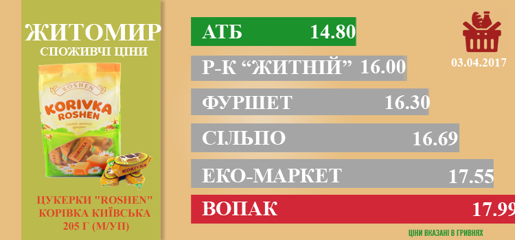 AТБ, пр. Миру, 15 А, Ринок "Житній", майдан Житній ринок, Вопак, вул. Київська, 87,Сільпо, майдан Житній ринок, 1, Фуршет,  вул. Вітрука, 9а,  ЕКО-маркет, вул. Мала Бердичівська, 2/7.