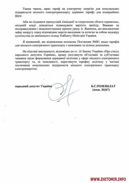 «У трамваях та тролейбусах їздять пенсіонери, школярі, студенти. Їм так дешевше. Житомирське трамвайно-тролейбусне управління за рік перевозить 45 мільйонів пасажирів. Проте, міський електротранспорт не є прибутковим, бо 65% його користувачів – пільговики. Трамваї та тролейбуси вже старі і на їх ремонт треба багато коштів, а інвестицій немає. Цей вид транспорту постійно перебуває не межі виживання. А тут доведеться ще й непідйомні суми віддавати за електроенергію! Це банкрутство! Якщо уряд не підтримає цю ініціативу, українці, в тому числі житомиряни, можуть залишитися без дешевого і екологічного транспорту», – говорить Борислав Розенблат.