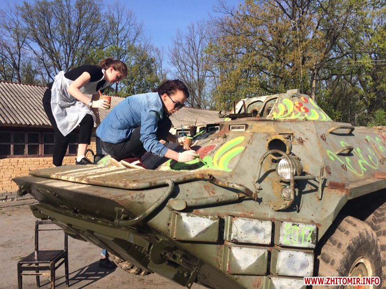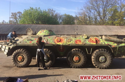 Учні Житомирського вищого професійного училища сервісу і дизайну, Новогуйвинської та Озерненської гімназій, а також діти військових долучились до декорування БТРу, який наразі відновлюють бійці ремонтного батальйону. Прикрашену петриківським розписом, дитячими малюнками та штучками маками бойову машину представлять уранці 9 травня біля монументу «Танк» у селищі Новогуйвинському, що під Житомиром.