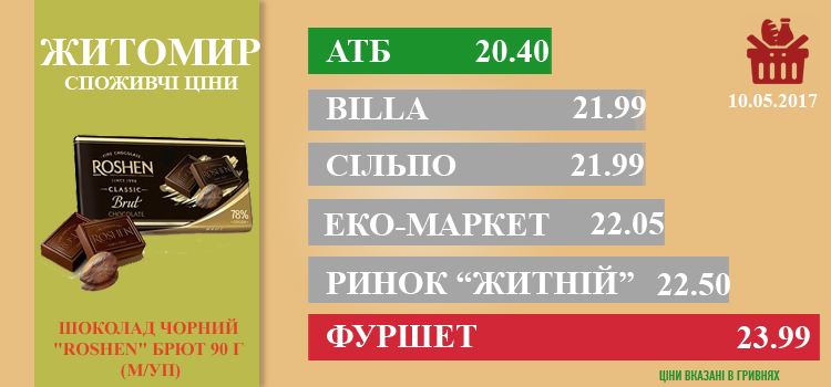 AТБ, пр. Миру, 15 А, Ринок "Житній", майдан Житній ринок, ЕКО-маркет, вул. Мала Бердичівська, 2/7, Фуршет, вул. Вітрука, 9 а,Сільпо, майдан Житній ринок, 1, Billa, пр. Миру, 15.