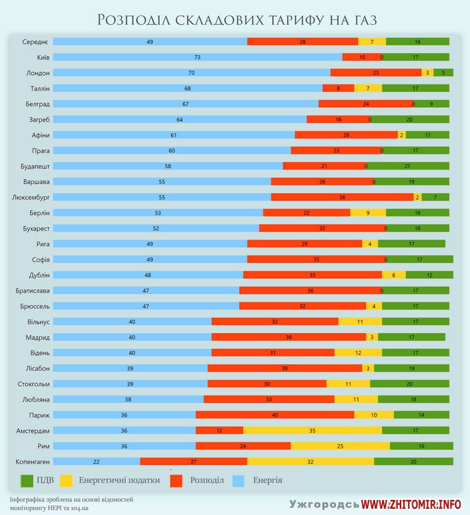 Проаналізуємо структуру тарифу на газ у нас та закордоном. Як показує моніторинг HEPI (Household Energy Price Index for Europe), у ЄС має місце поділ тарифу на енергоносії для кінцевих користувачів на чотири компоненти: енергію, розподіл, енергетичні податки і ПДВ. Квітневе дослідження показує, що енергія (ринковий компонент) – це 49% вартості для кінцевого користувача природного газу, розподіл – 28%, податки на енергію – 7% і ПДВ — 16%.