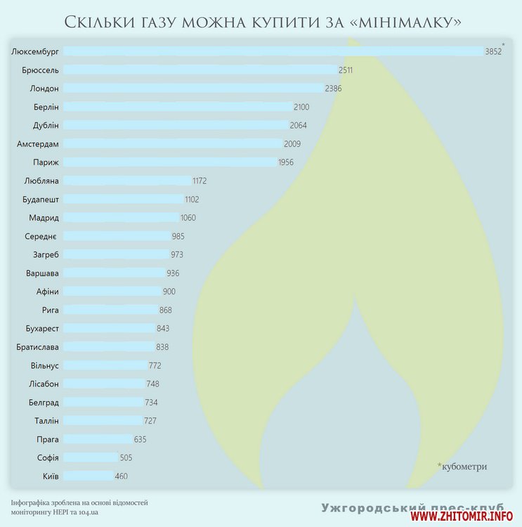 Спробуємо, втім, зробити власне порівняння на основі мінімальної заробітної плати. Так, у січні 2017 року українець мінімально заробляв 3200 гривень або майже 114 євро. Мінімальні зарплати європейців за цей же період дивіться тут (Данія, Швеція, Італія та Австрія є виключенням і тут виділити єдину мінімальну зарплату неможливо). Оскільки, найсвіжіших даних немає, припустимо, що до квітня ці числа не змінювалися. Далі поділимо їх на тариф, аби дізнатися, скільки кубометрів газу зможе придбати на мінімальну зарплату мешканець тої чи іншої країни.