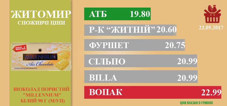 AТБ, пр. Миру, 15 А, Ринок "Житній", майдан Житній ринок, Сільпо, майдан Житній ринок, 1, Фуршет, вул. Вітрука, 9 а,Billa, пр. Миру, 15, Вопак, вул. Київська, 87.