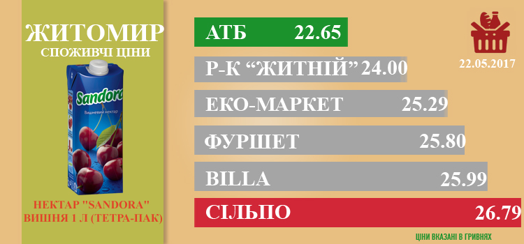 AТБ, пр. Миру, 15 А, Ринок "Житній", майдан Житній ринок, Сільпо, майдан Житній ринок, 1, Фуршет, вул. Вітрука, 9 а,Billa, пр. Миру, 15, ЕКО-маркет, вул. Мала Бердичівська, 2/7.