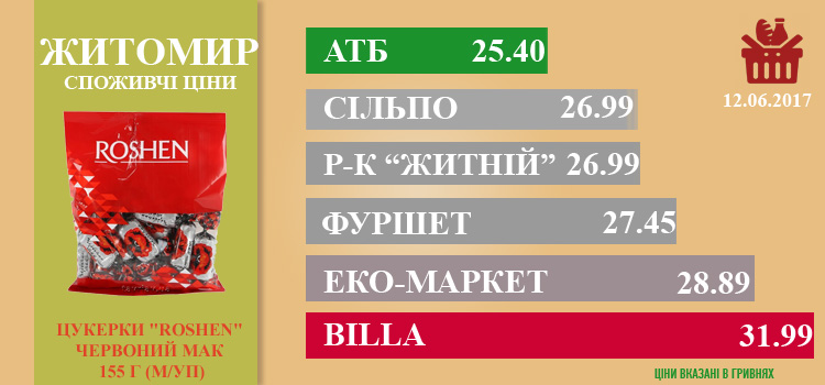 AТБ, пр. Миру, 15 А, Ринок "Житній", майдан Житній ринок,   ЕКО-маркет, вул. Мала Бердичівська, 2/7,Фуршет, вул. Вітрука, 9 а. 1, Сільпо, майдан Житній ринок, 1,Billa, пр. Миру, 15.