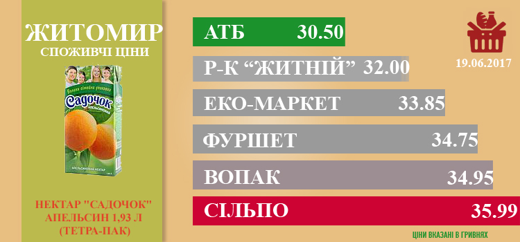 AТБ, пр. Миру, 15 А, Ринок "Житній", майдан Житній ринок,  Фуршет, вул. Вітрука, 9 а. 1, Сільпо, майдан Житній ринок, 1,ЕКО-маркет, вул. Мала Бердичівська, 2/7,Вопак, вул. Київська, 87.