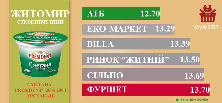 AТБ, пр. Миру, 15 А, Ринок "Житній", майдан Житній ринок,  Фуршет, вул. Вітрука, 9 а. 1, Сільпо, майдан Житній ринок, 1,ЕКО-маркет, вул. Мала Бердичівська, 2/7,Billa, пр. Миру, 15.
