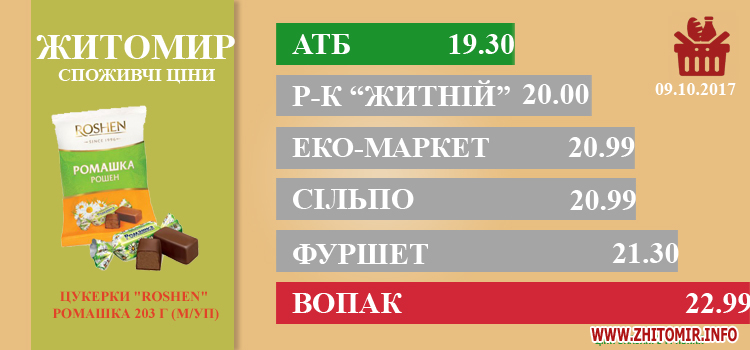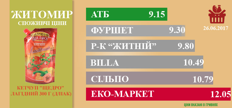 AТБ, пр. Миру, 15 А, Ринок "Житній", майдан Житній ринок,  Фуршет, вул. Вітрука, 9 а. 1, Сільпо, майдан Житній ринок, 1,ЕКО-маркет, вул. Мала Бердичівська, 2/7,Billa, пр. Миру, 15.