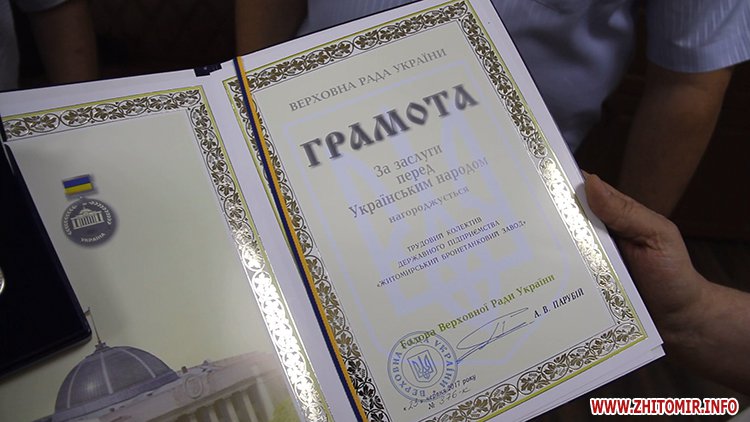 Житомирський бронетанковий завод отримав відзнаку від українського парламенту за вагомий внесок у підвищення обороноздатності країни. Передати нагороду трудовому колективу підприємства приїхали народні депутати України із фракції «Народного фронту» Дмитро Тимчук та Вадим Кривенко.