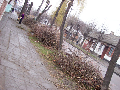На нескольких улицах Житомира коммунальными предприятиями очищены были кроны деревьев. Но обрезанные ветки так и остались лежать вдоль дороги. Особенно заметно это на улице Шелушкова.