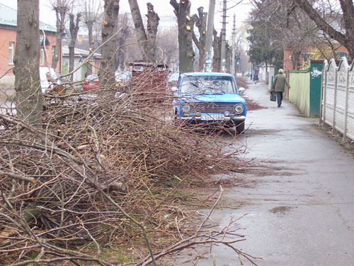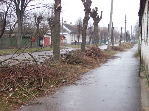 На нескольких улицах Житомира коммунальными предприятиями очищены были кроны деревьев. Но обрезанные ветки так и остались лежать вдоль дороги. Особенно заметно это на улице Шелушкова.