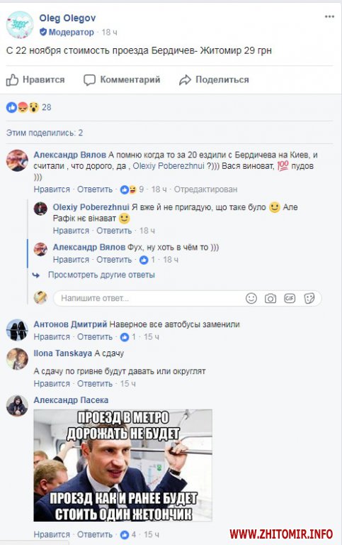 З 22 листопада вартість проїзду у маршрутному таксі «Бердичів – Житомир» зросла до 29 гривень. Про це повідомляють бердичівляни у соціальній мережі Facebook.