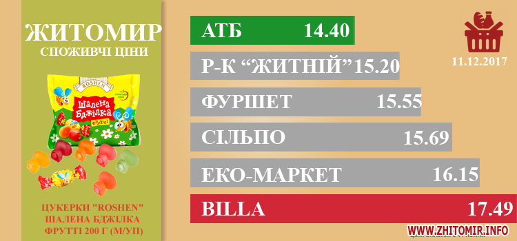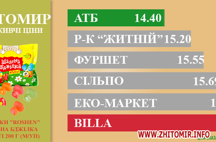 МОНІТОРИНГ ЗДІЙСНЕНО МЕТОДОМ КОНТРОЛЬНОЇ ЗАКУПІВЛІ, У МІСЦЯХ ПРОДАЖУ: AТБ, пр. Миру, 15 А, Ринок "Житній", майдан Житній ринок, Сільпо, майдан Житній ринок, 1, Фуршет, вул. Вітрука, 9 а, ЕКО-маркет, вул. Мала Бердичівська, 2/7, Billa, пр. Миру, 15.