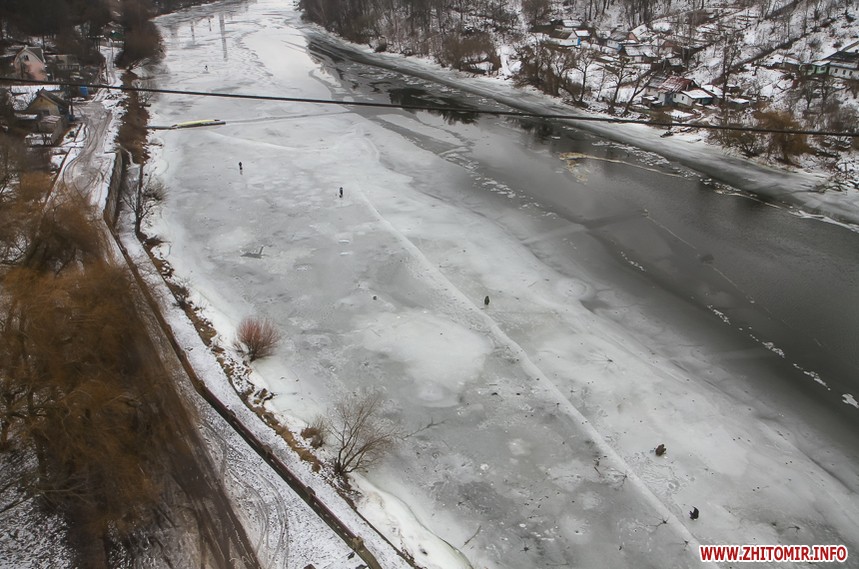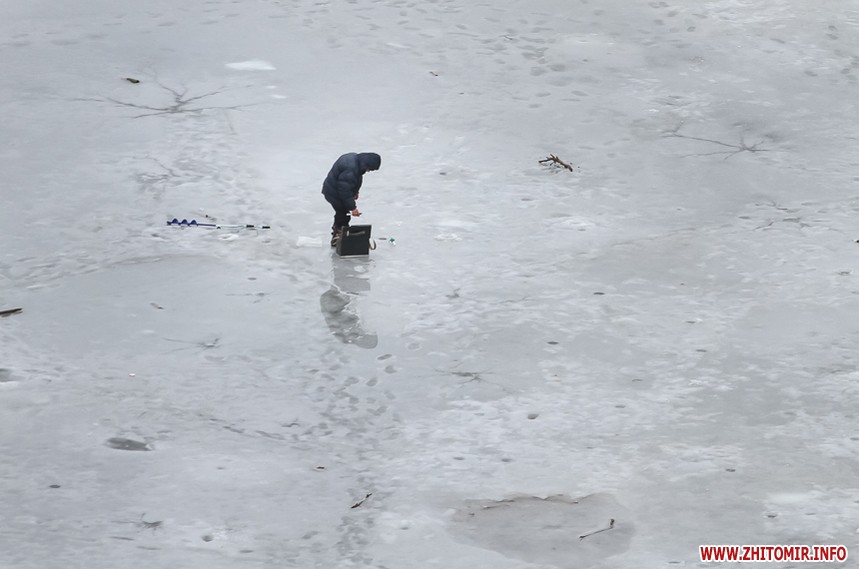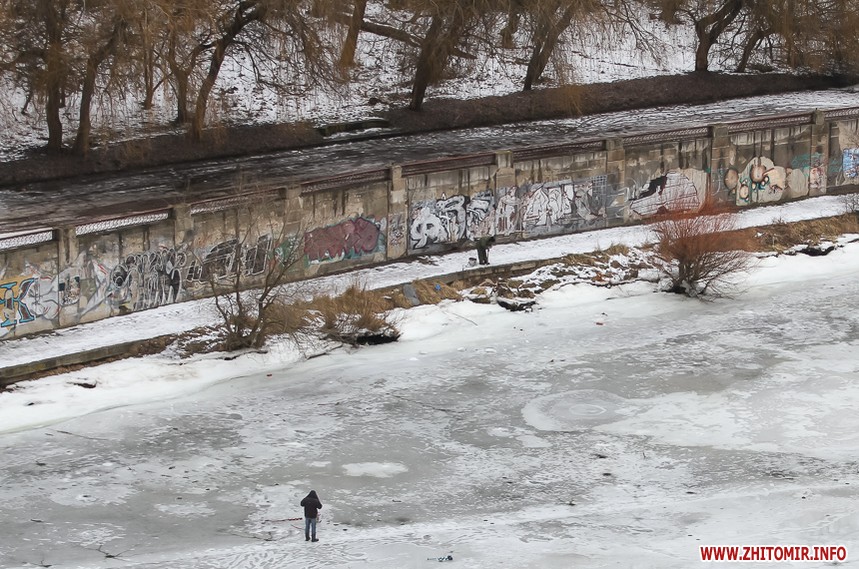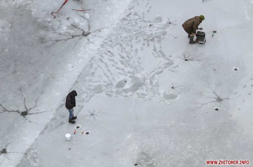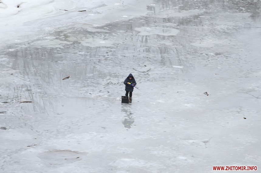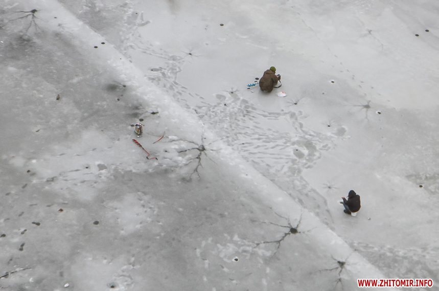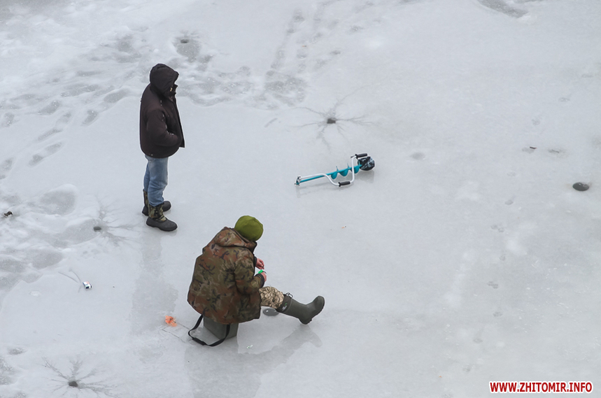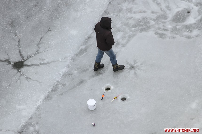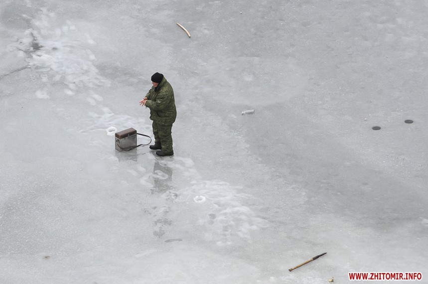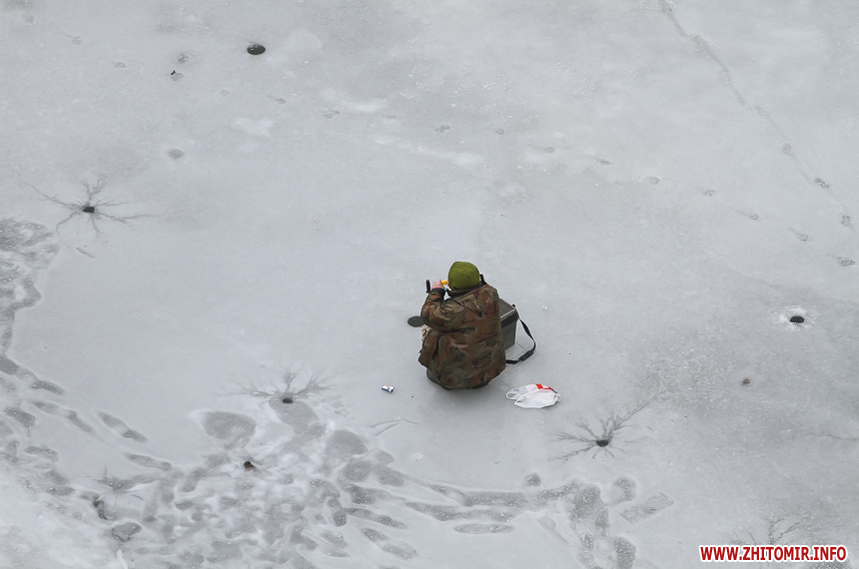 Не зважаючи на плюсову температуру 29 січня, у Житомирі під пішохідним мостом у парку Гагаріна рибалить шестеро рибалок-відчайдухів.