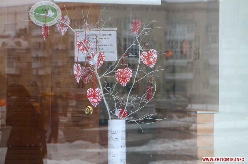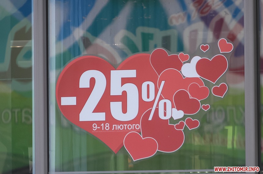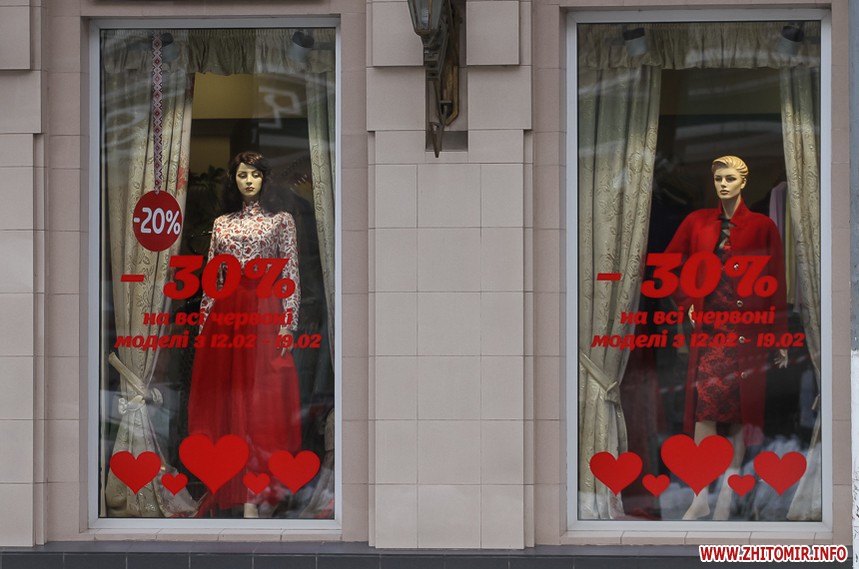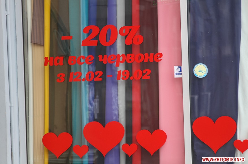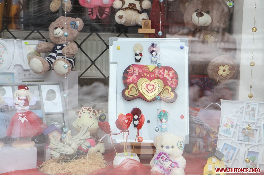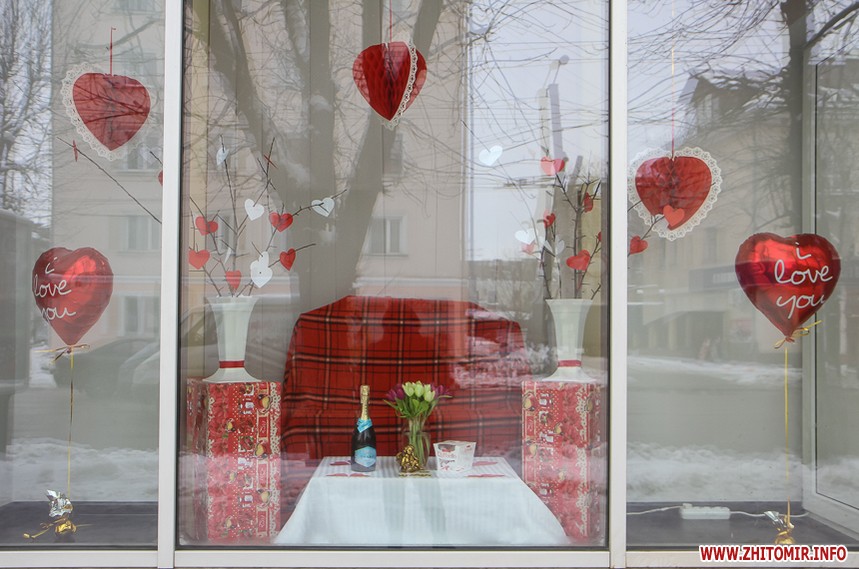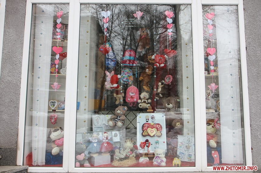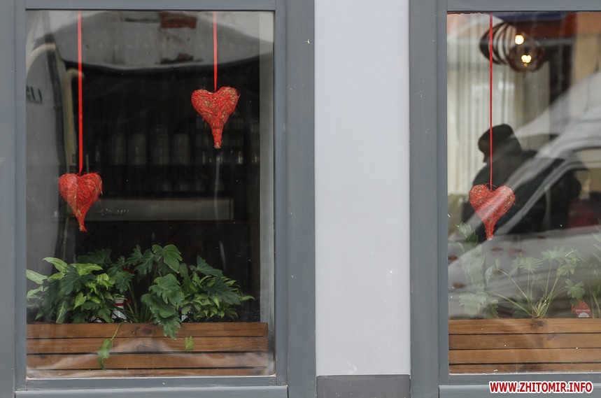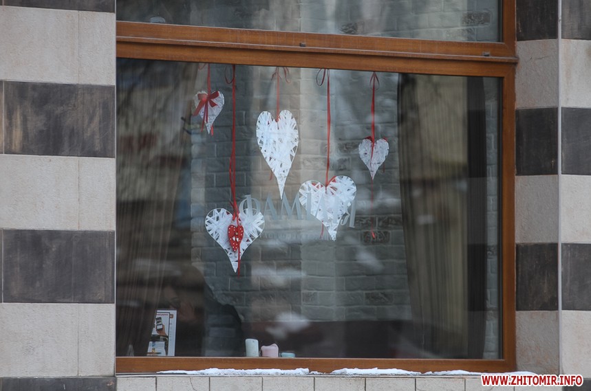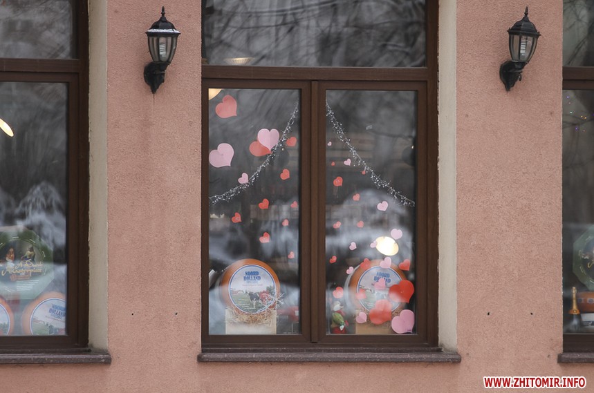У Житомирі вже гарною традицією стало тематично прикрашати фасади своїх закладів до свят. На Київській, Театральній та Бердичівській до Дня закоханих вітрини магазинів і кафе вкрилися сердечками. А от на Михайлівській лише три заклади прикрасили свої вікна. Хтось використовує такі прикраси, щоби прорекламувати подарунки, інші – так повідомляють потенційних покупців про знижки.