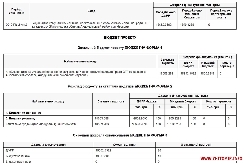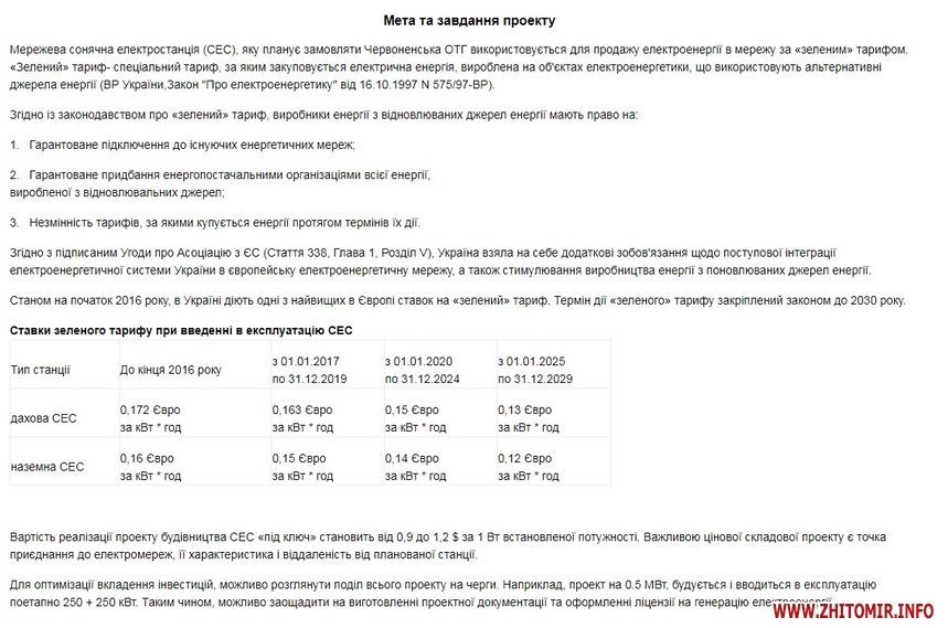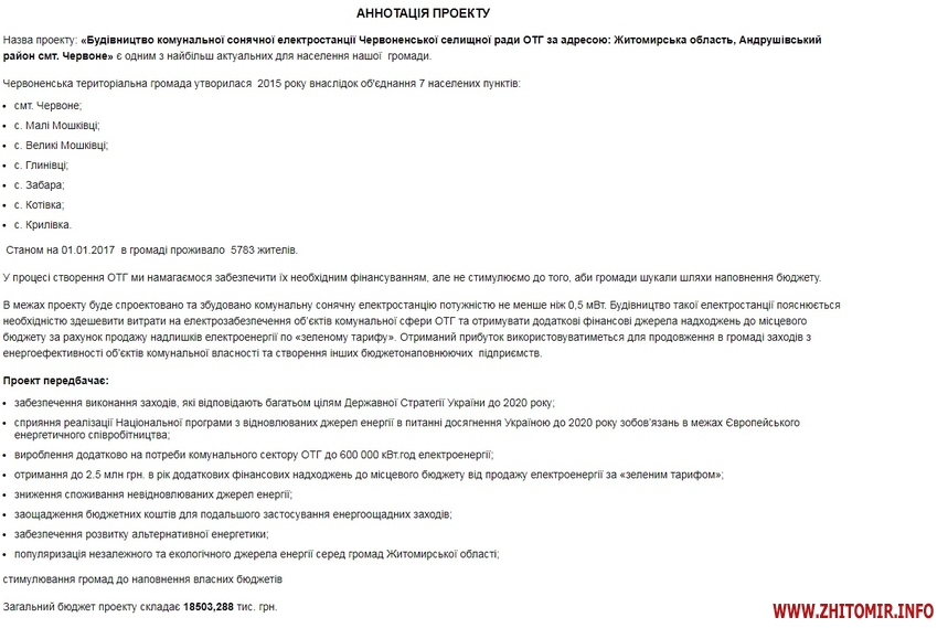 Червоненська територіальна громада Житомирської області хоче за кошти Державного фонду регіонального розвитку (ДФРР) побудувати сонячну електростанцію, а прибуток від її роботи витрачати на екологічні проекти.