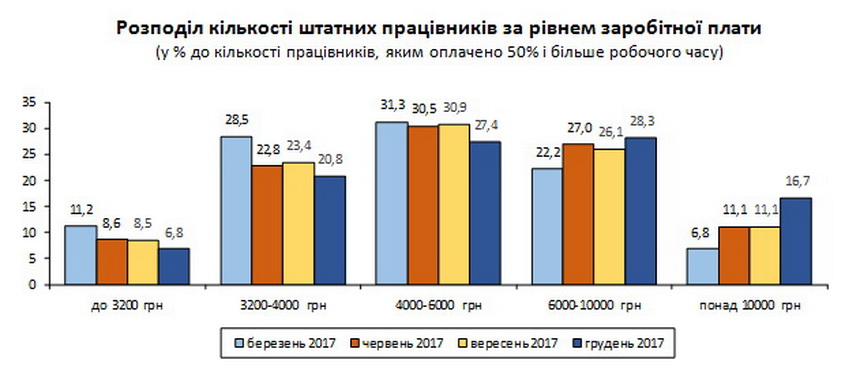 «У грудні 2017 року нарахування в межах мінімальної заробітної плати мали 6,8% штатних працівників, що на 4,4 відсоткового пункту менше, ніж у березні 2017 року. Частка працівників із заробітною платою від 3200 грн до 6000 грн становила 48,2%, понад 6000 грн – 45,0%, при цьому у 16,7% штатних працівників нарахована заробітна плата перевищувала 10000 грн», - інформує статистика.