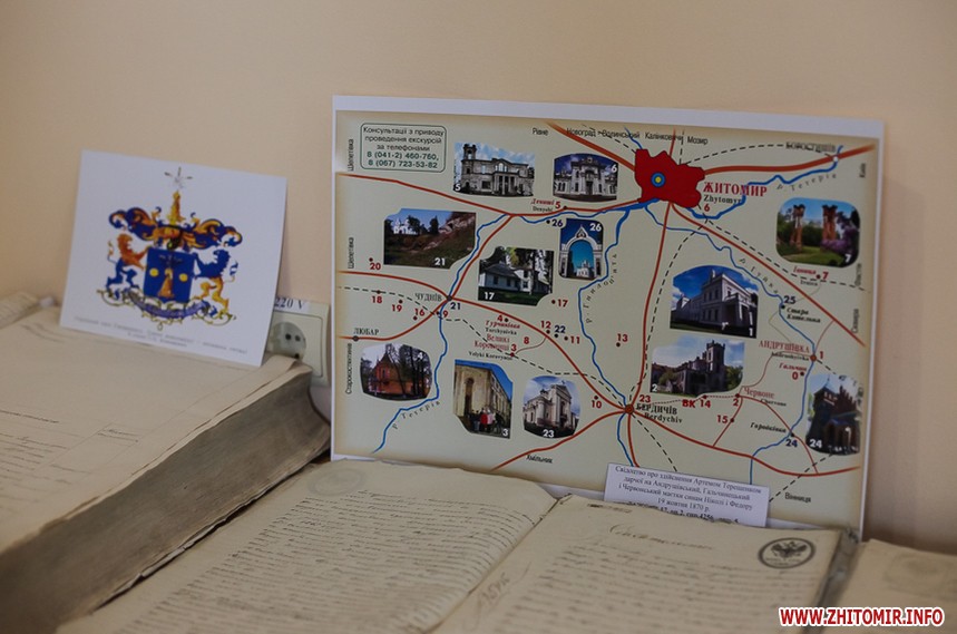 На виставці представлені документів Національного архівного фонду України про засновників цукрової промисловості в нашому краї, а саме про родину дворян Терещенків. Цікаві документи нотаріального характеру, які підтверджують придбання Артемієм Терещенком Андрушівського та Червоненського маєтків, розподіл їх між синами Ніколою та Федором, засновниками цукрової промисловості на території сучасної Житомирщини.
