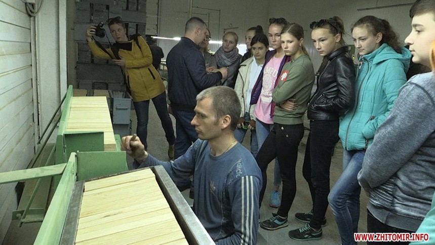 А доки прибирання триває, на підприємство завітала група школярів з Чуднова. Керівництво компанії проводить екскурсію розповідає дітям про те, як виготовляється дубовий паркет, який експортують у понад 15 країн світу. До дуба тут ставляться з великою повагою, не просто як до сировини, тож налагодили виробництво таким чином, аби жодна частина деревини не йшла у відходи.