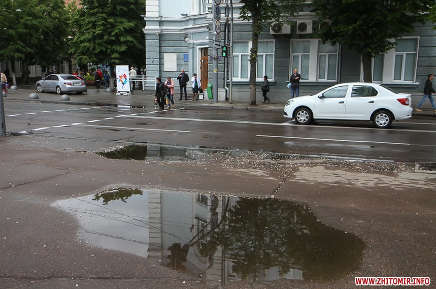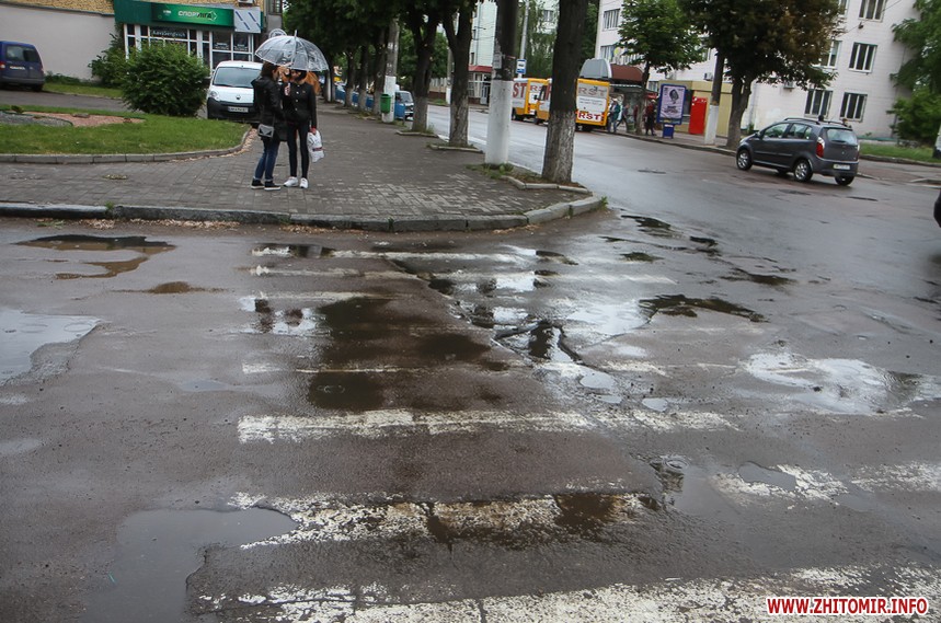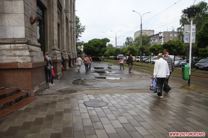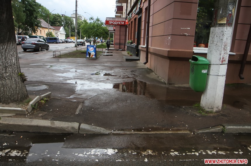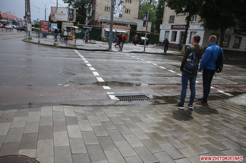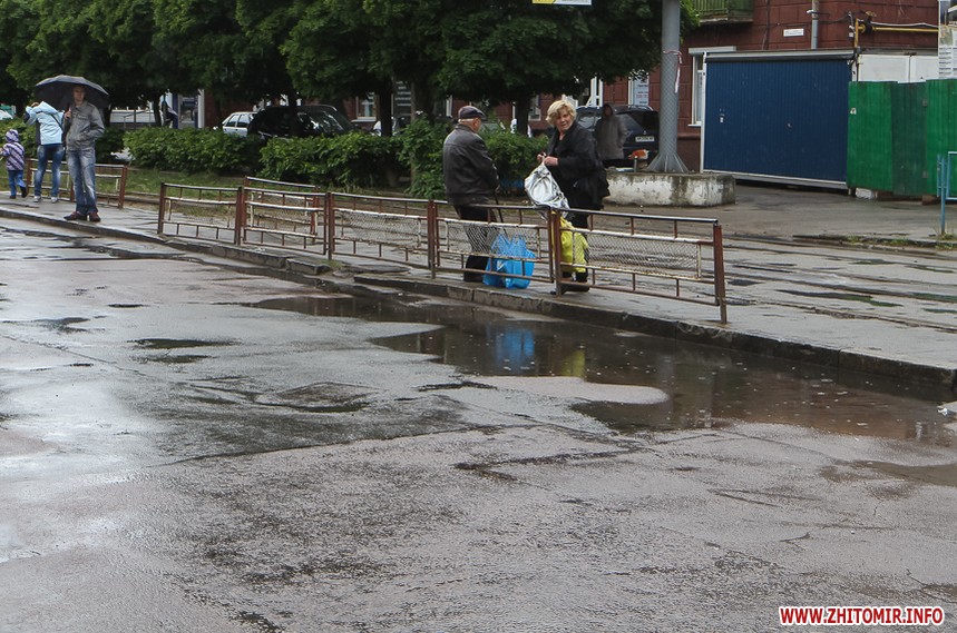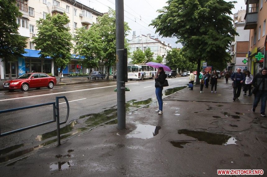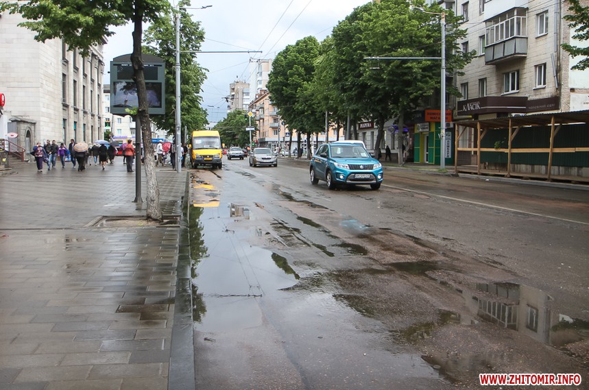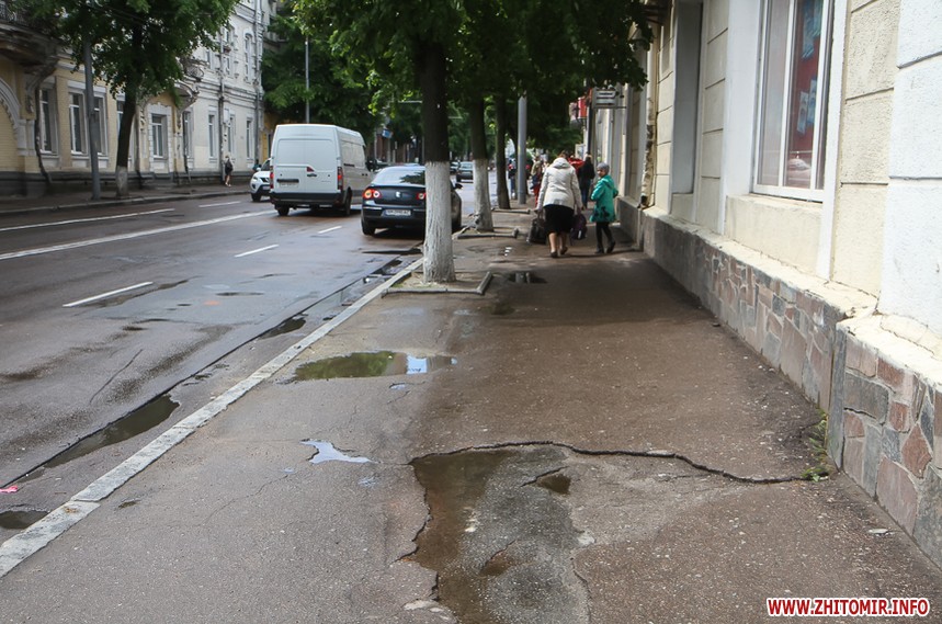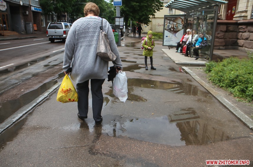Вдень 14 травня після дощу на центральних вулицях Житомира калюжі яскраво показують всі нерівності тротуарів, особливо це відчутно біля зупинок громадського транспорту, коли приходиться перестрибувати через доволі широкі «рівчаки з водою».