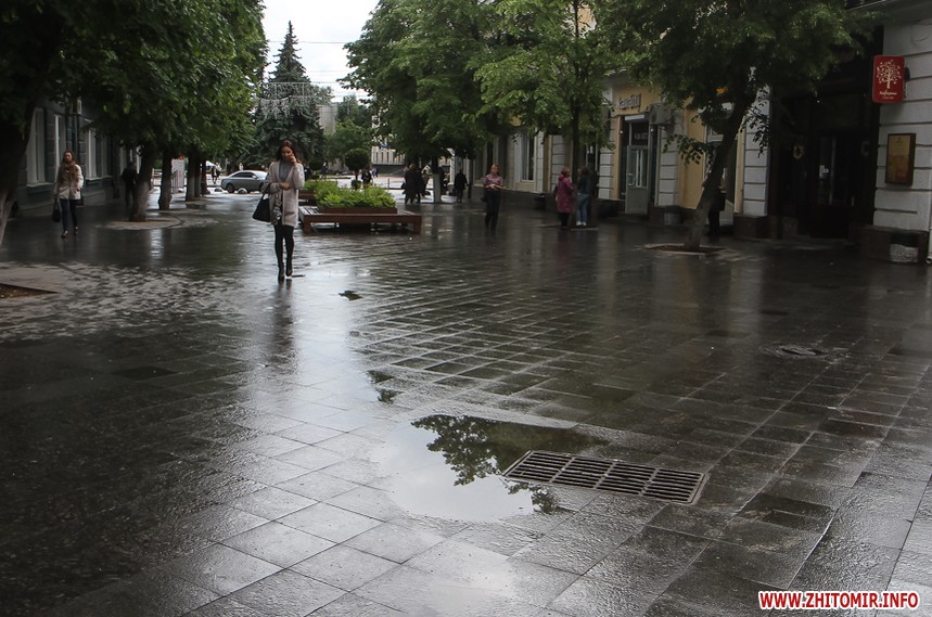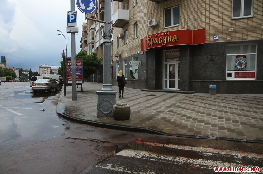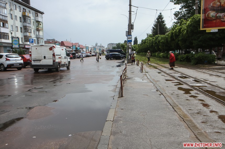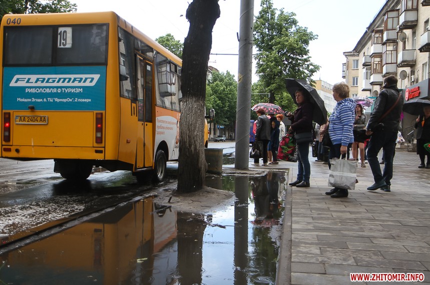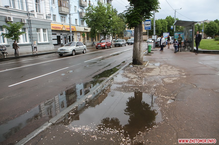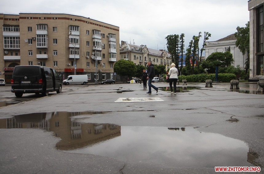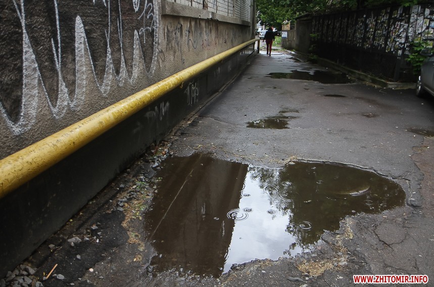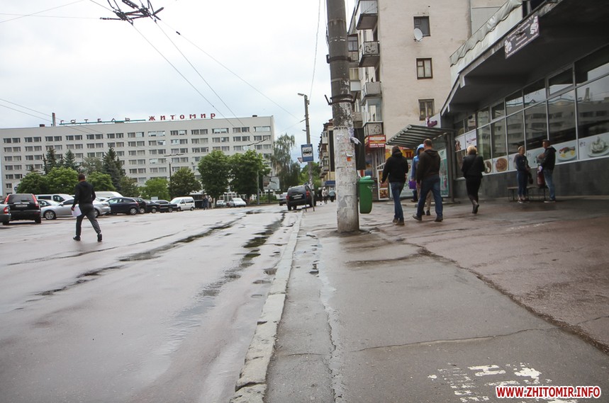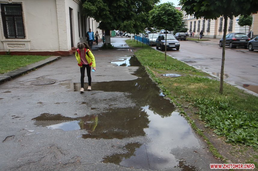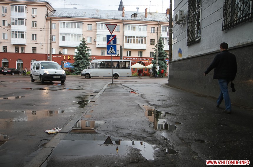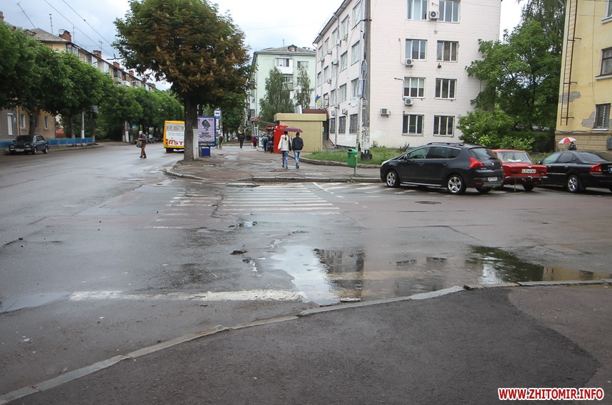 Вдень 14 травня після дощу на центральних вулицях Житомира калюжі яскраво показують всі нерівності тротуарів, особливо це відчутно біля зупинок громадського транспорту, коли приходиться перестрибувати через доволі широкі «рівчаки з водою».