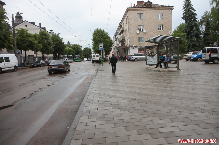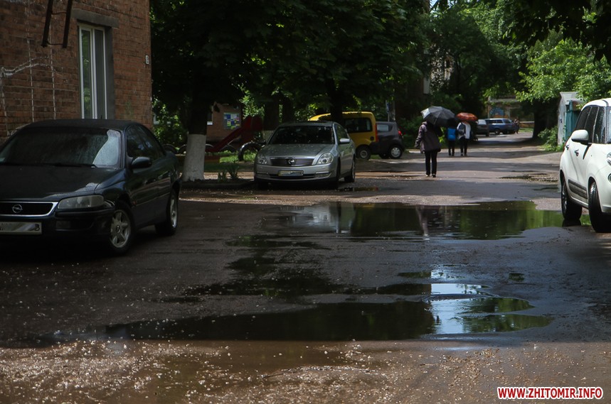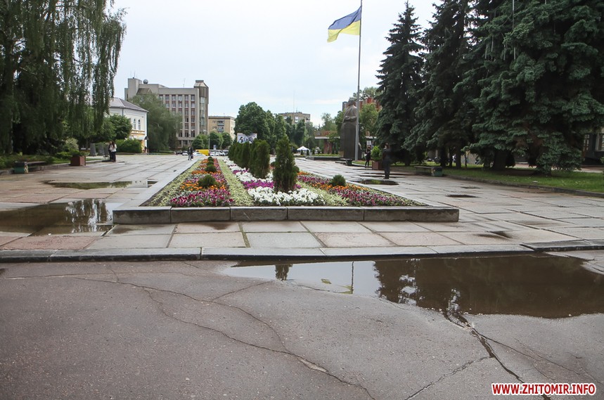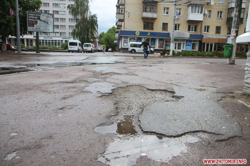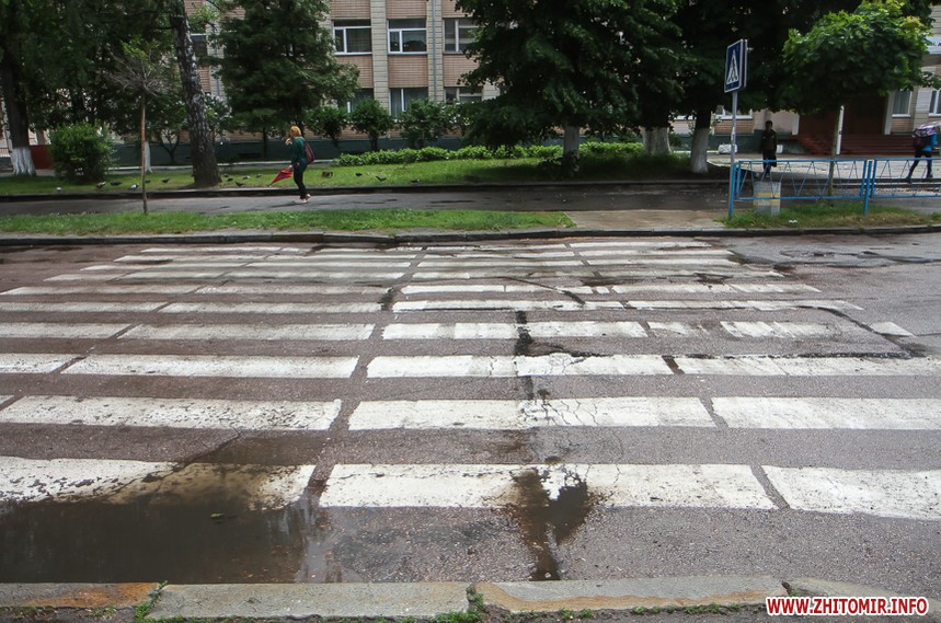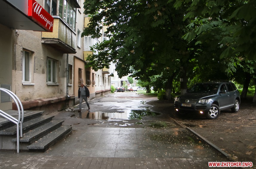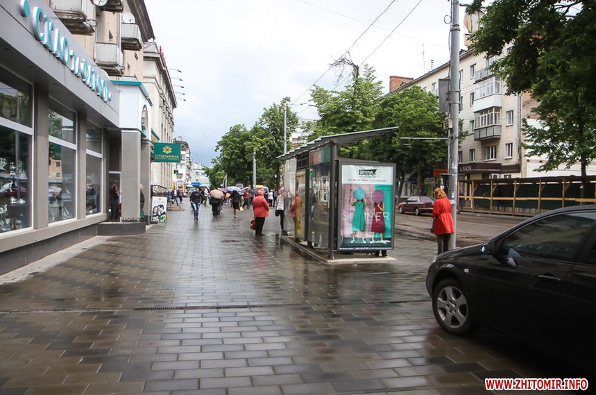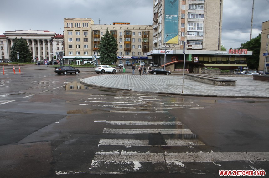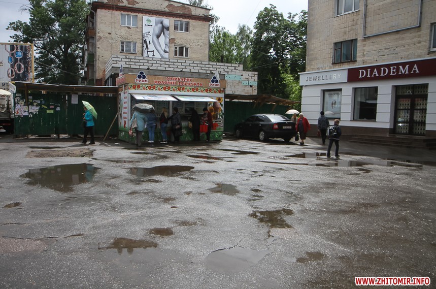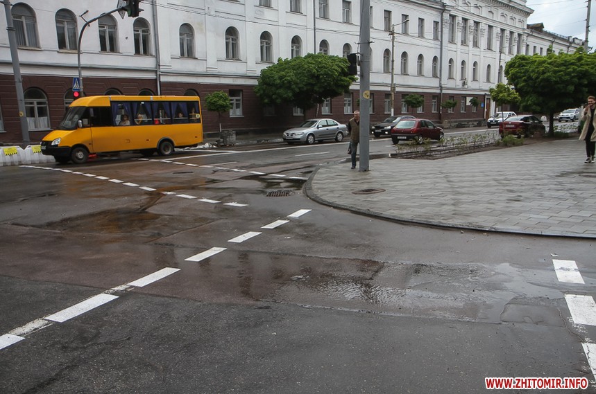 Вдень 14 травня після дощу на центральних вулицях Житомира калюжі яскраво показують всі нерівності тротуарів, особливо це відчутно біля зупинок громадського транспорту, коли приходиться перестрибувати через доволі широкі «рівчаки з водою».