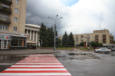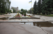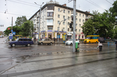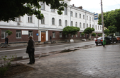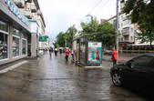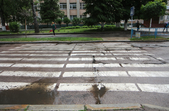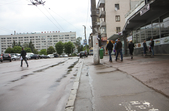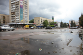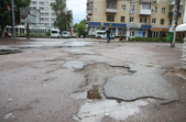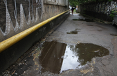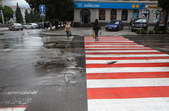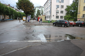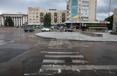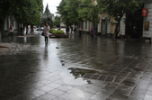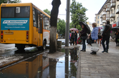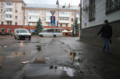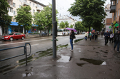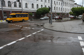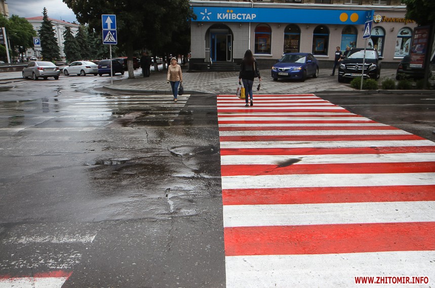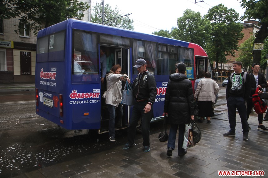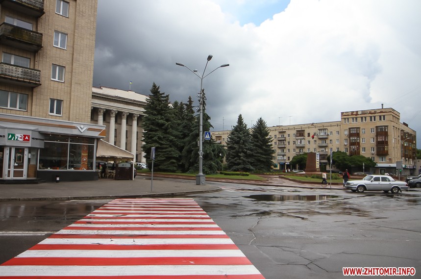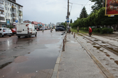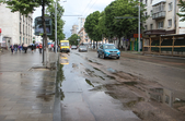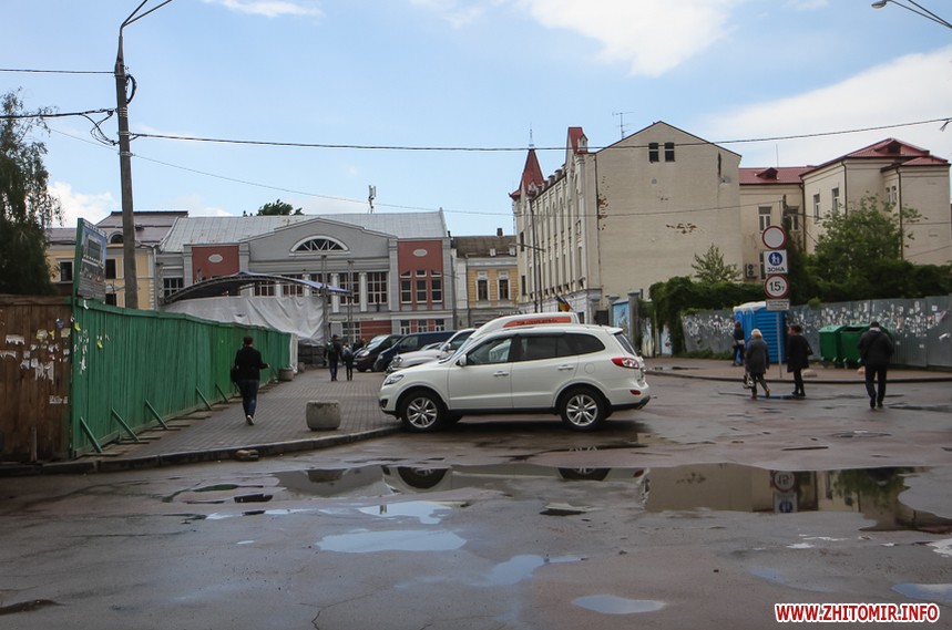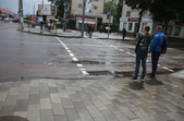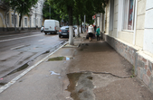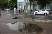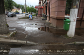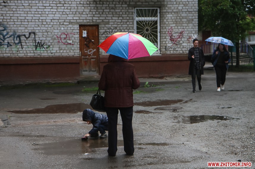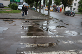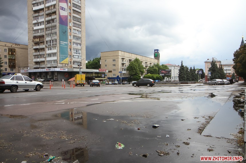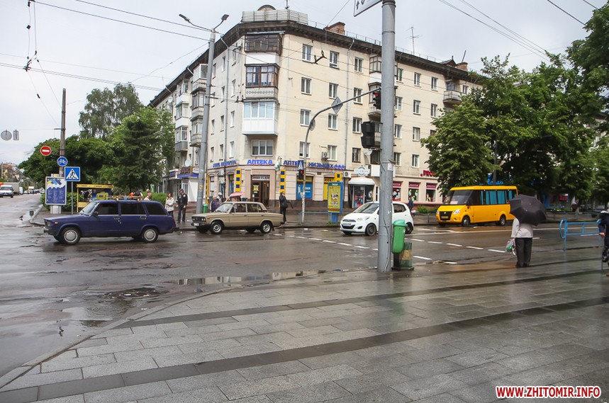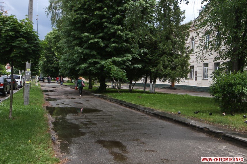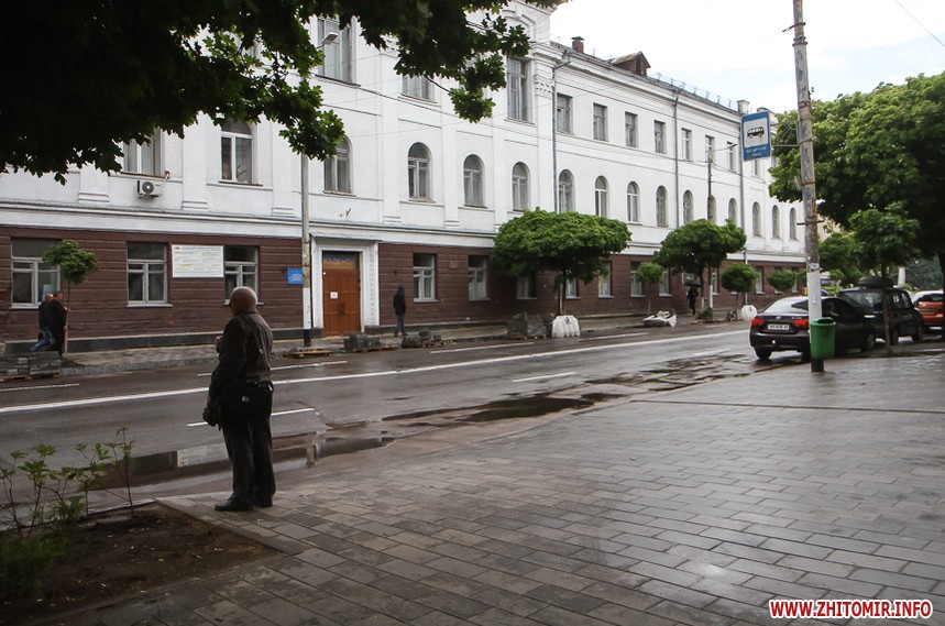 Вдень 14 травня після дощу на центральних вулицях Житомира калюжі яскраво показують всі нерівності тротуарів, особливо це відчутно біля зупинок громадського транспорту, коли приходиться перестрибувати через доволі широкі «рівчаки з водою».