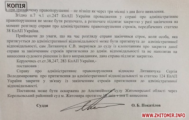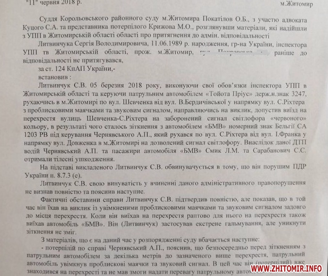 5 березня 2018 року близько 17:00 на перехресті вулиць Шевченка та Ріхтера у Житомирі сталася дорожньо-транспортна пригода за участі автомобіля поліції та BMW. Від зіткнення тоді постраждали четверо пасажирів BMW, серед яких хлопчик семи років та чоловік 56 років. За даною справою відкрили адміністративну справу, яка тричі розглядалася Корольовським судом. Проте, згодом, справу закрили.