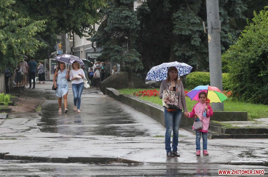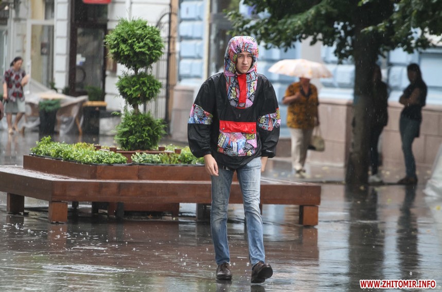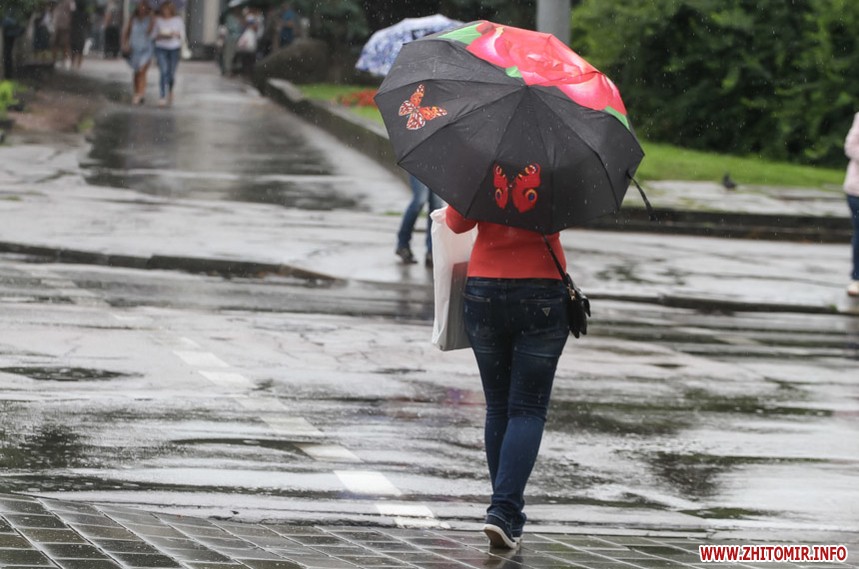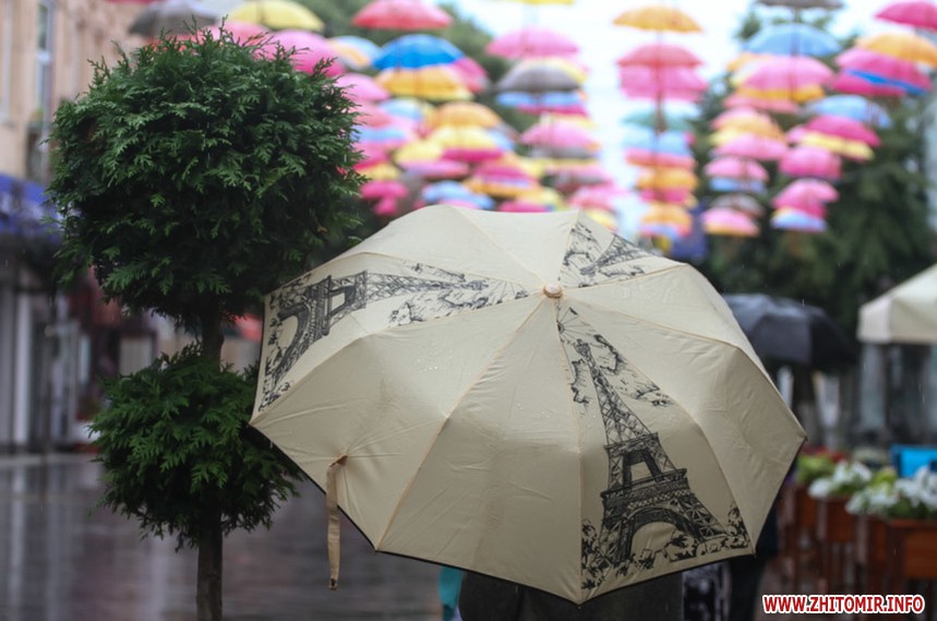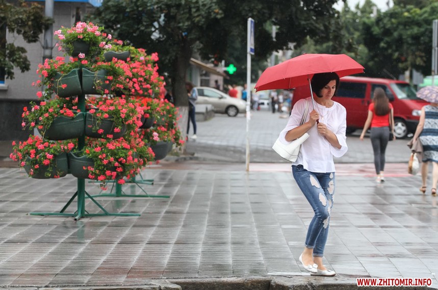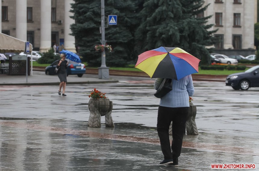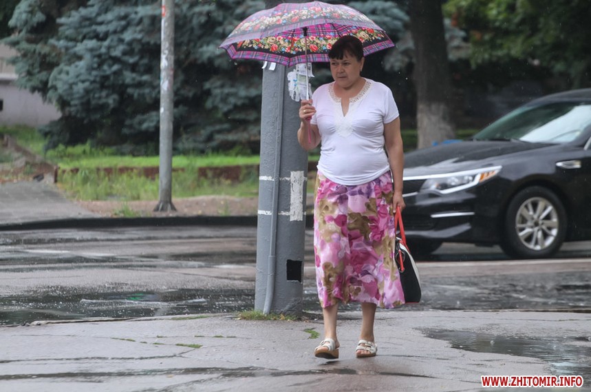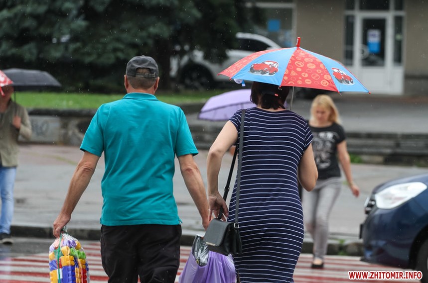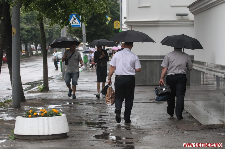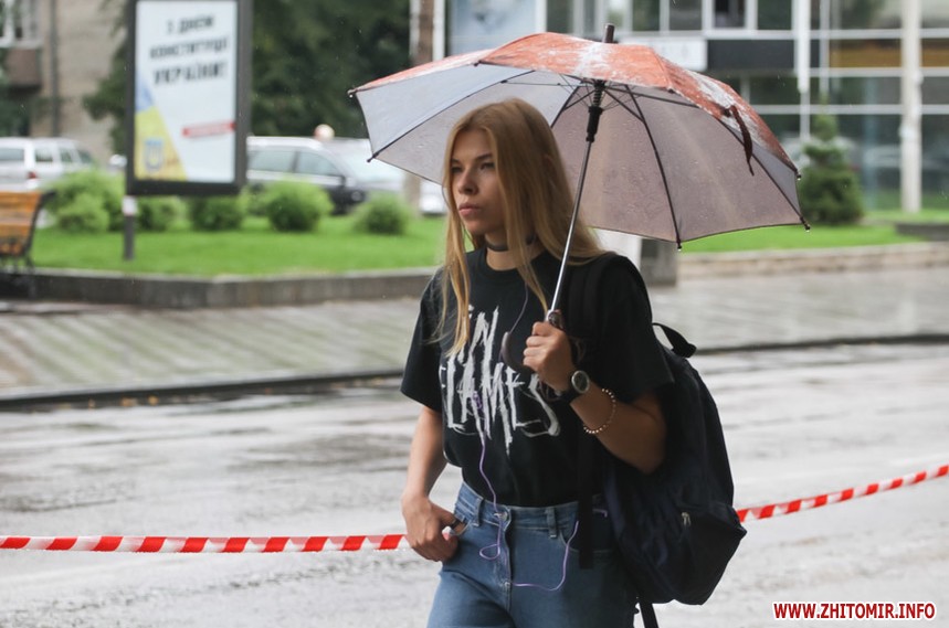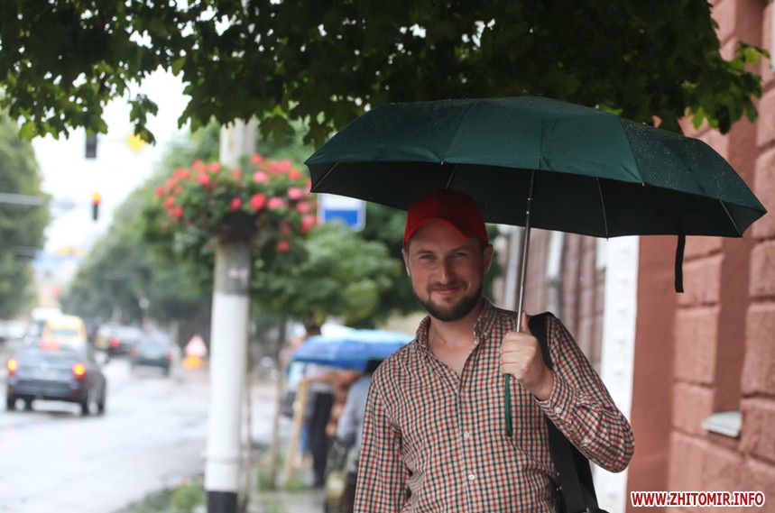 Похмурий ранок 11 липня у Житомирі продовжився короткочасним дощем. Більшість житомирян, мабуть, очікували, що задощить, тому заздалегідь озброїлися парасольками.