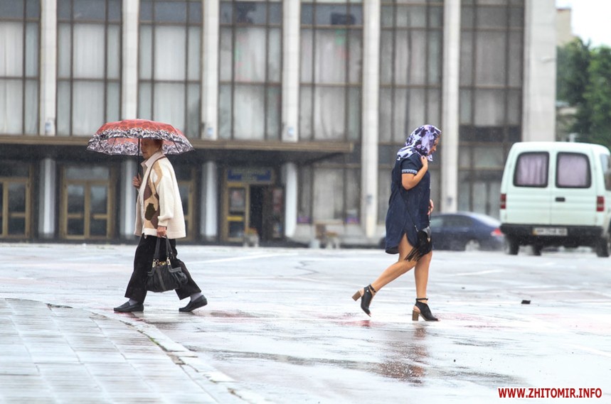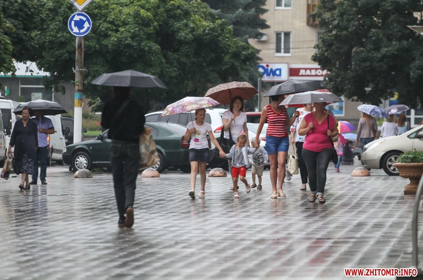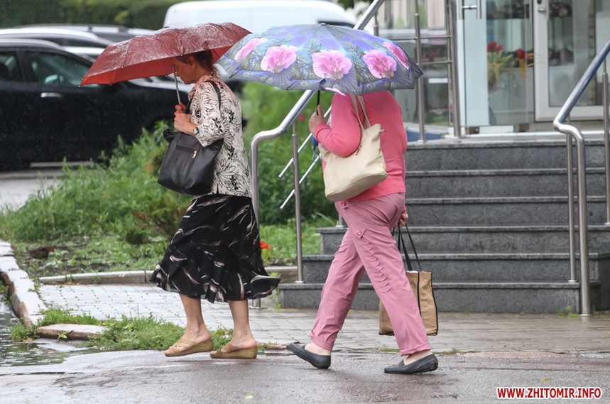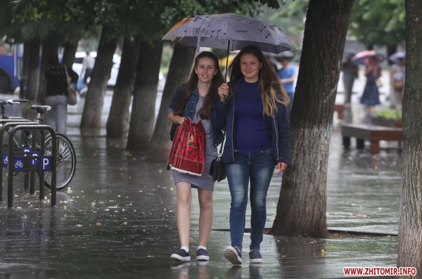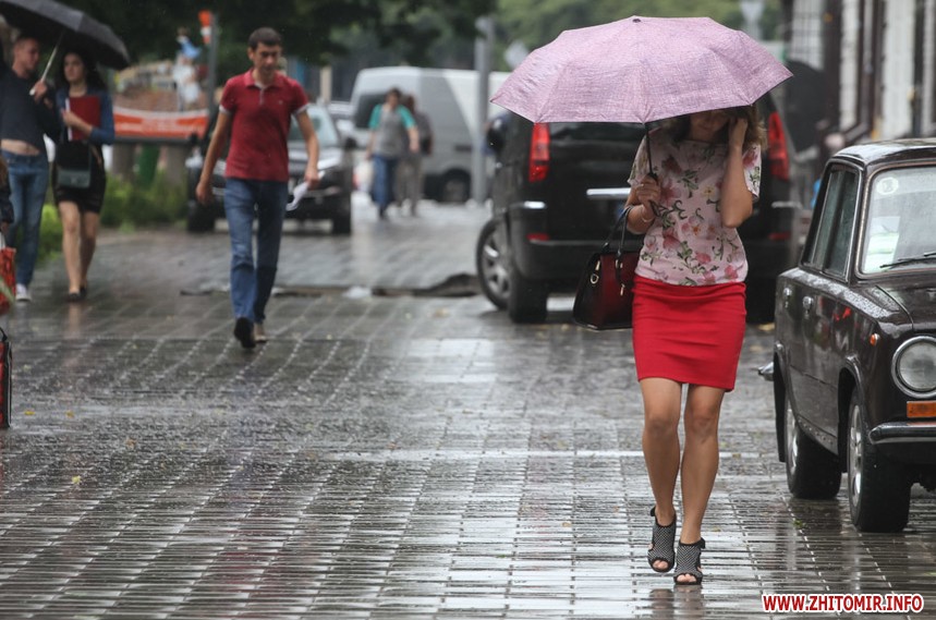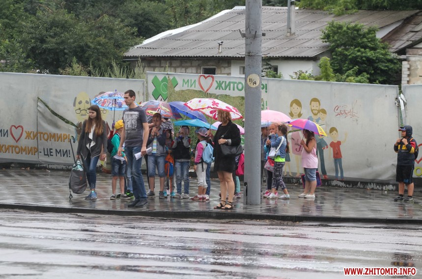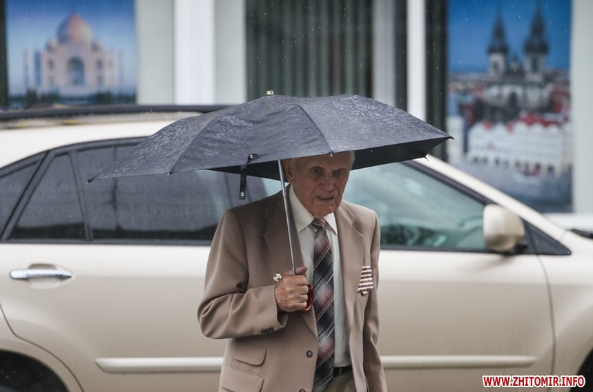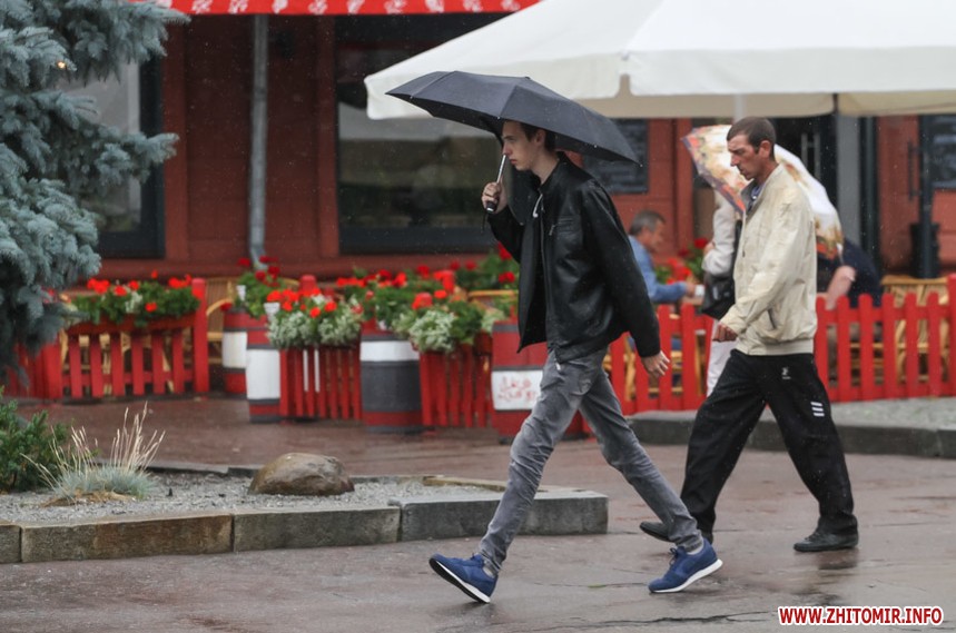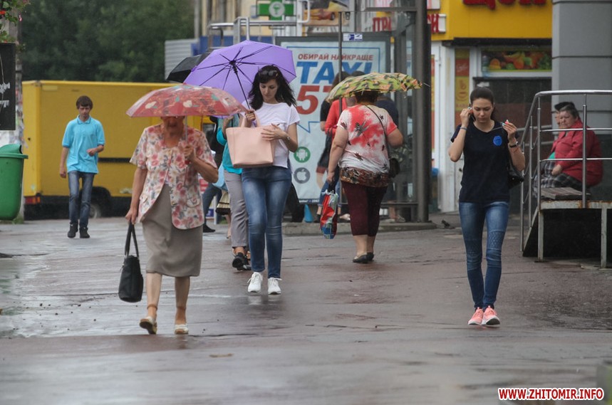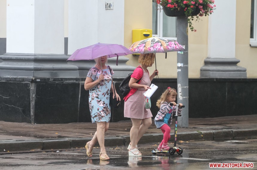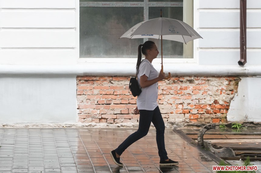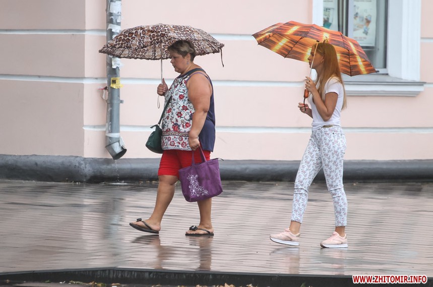 Похмурий ранок 11 липня у Житомирі продовжився короткочасним дощем. Більшість житомирян, мабуть, очікували, що задощить, тому заздалегідь озброїлися парасольками.