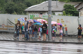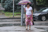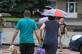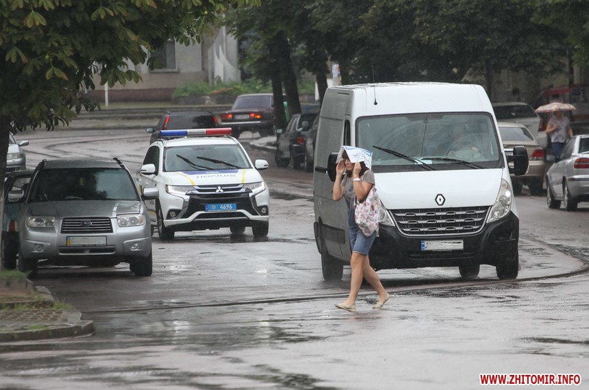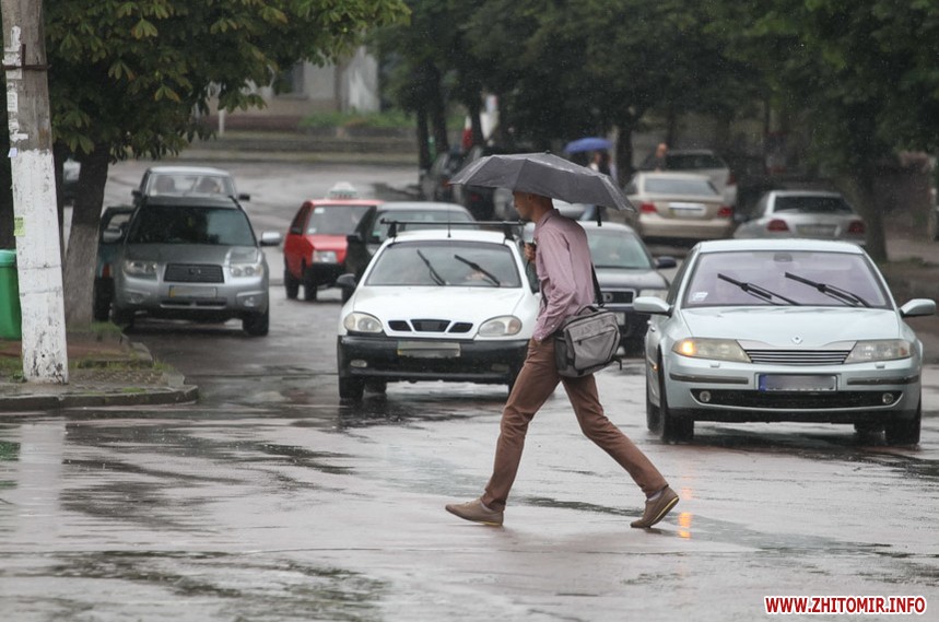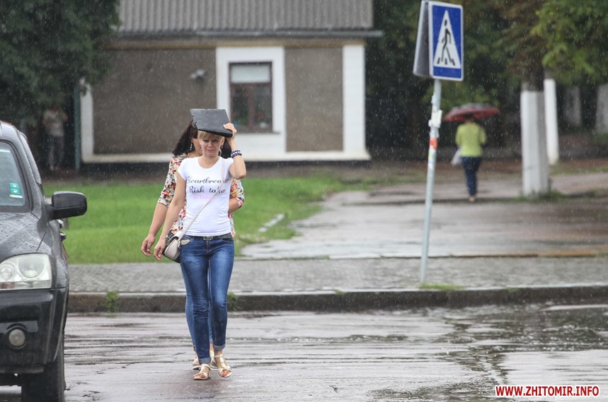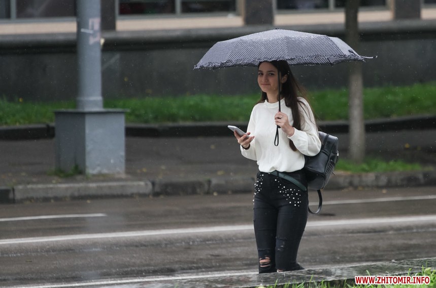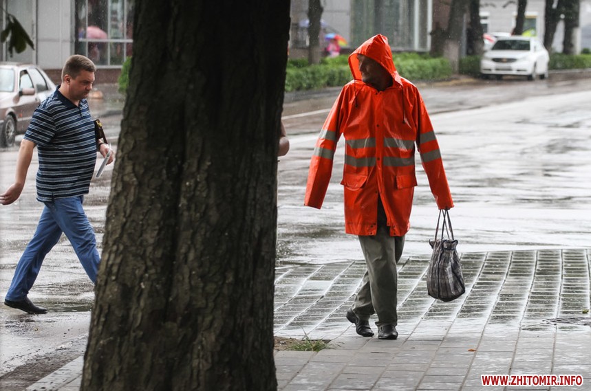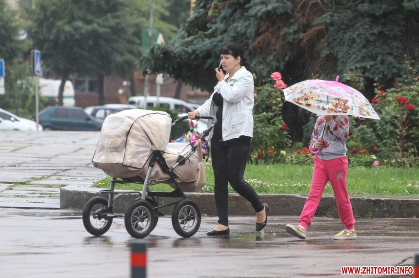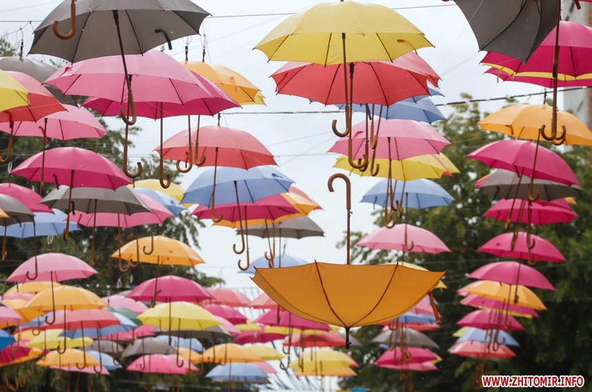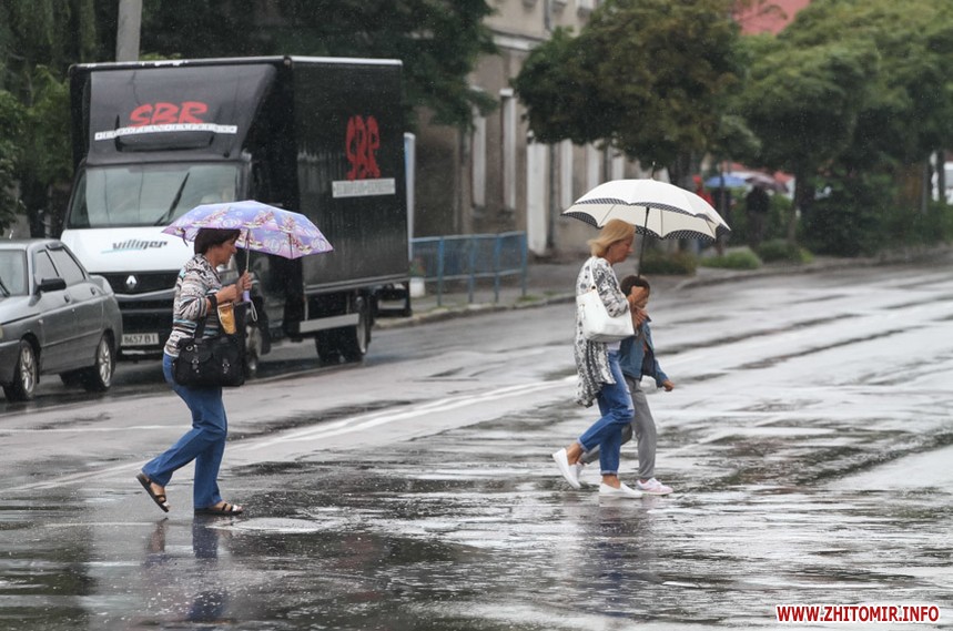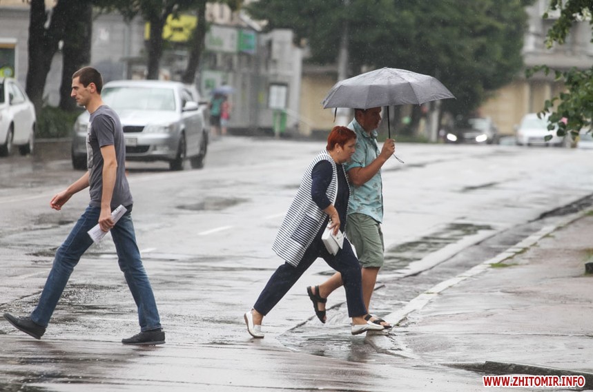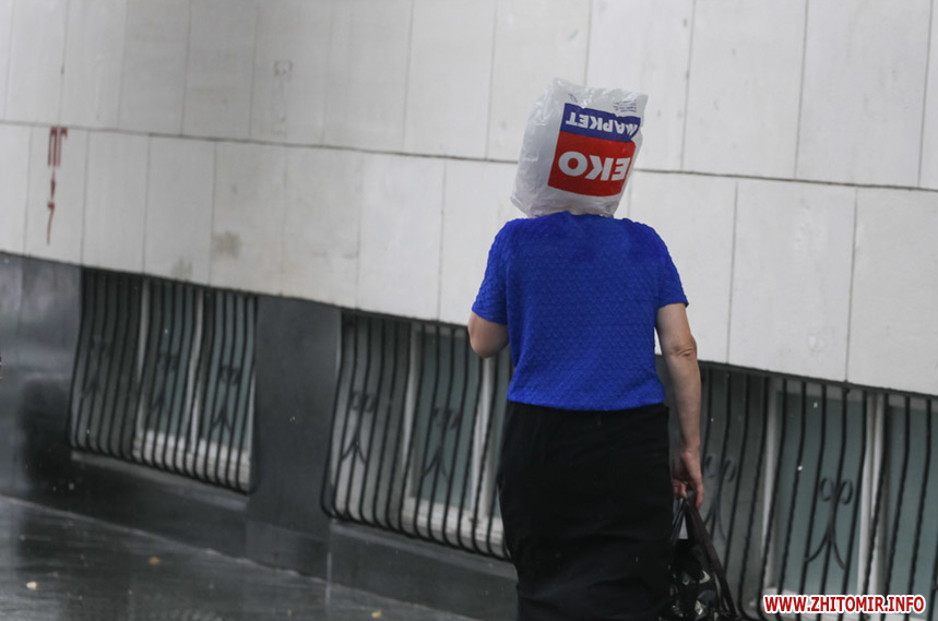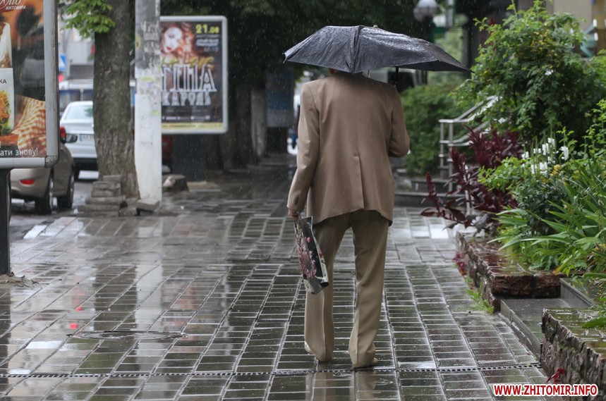 Похмурий ранок 11 липня у Житомирі продовжився короткочасним дощем. Більшість житомирян, мабуть, очікували, що задощить, тому заздалегідь озброїлися парасольками.