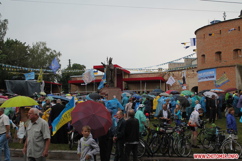 «По обіді 21 липня працівники поліції перекрили для руху автівок вулицю Соборну, а транзитний та місцевий транспортний потік направили по вулицям Житомирська, Шевченка та Шолом-Алейхема, що викликало на цих вулицях чимало заторів. Організатори святкових заходів, як завжди, гарно підготувались до них. Під стінами святині розгорнули кілька сцен, встановили біотуалети, ємності з водою а в фойє райдержадміністрації розвернули своєрідний медпункт. Хоча, тут же чергували і бригади швидкої допомоги,і рятувальники, і заступники міського голови, які оперативно приймали рішення щодо дій комунальних служб. Одне тільки не могли передбачити організатори урочистостей – погоду. Дощ сьогодні в Бердичеві йшов майже весь день то більше лив, то трохи припинявся. Майже всі паломники встигли по кілька разів намокнути і на марші, і безпосередньо на місці святкувань. Дощовики і парасольки були цього дня найбільш затребуваними предметами гостей і господарів свята. Люди ховались під дахом на сходами до будівлі РДА, попід густими ялинками поблизу та іншими деревами на алеї. О 18.00 розпочалась перша офіційна служба божа цьогорічних святкувань, і сталось майже чудо. Чорне небо над Бердичевом стало світліти, через кільканадцять хвилин дощ перестав, а ще трохи по тому вечірнє сонце засяяло над містом.», - йдеться у повідомленні.