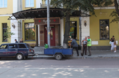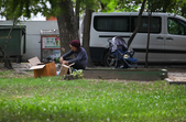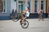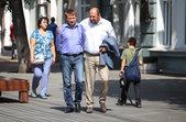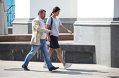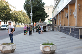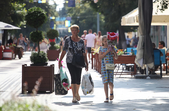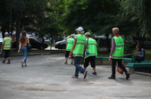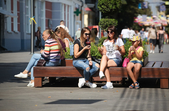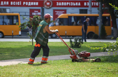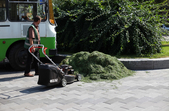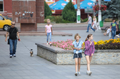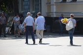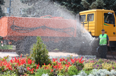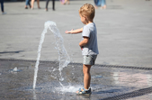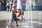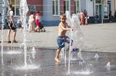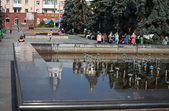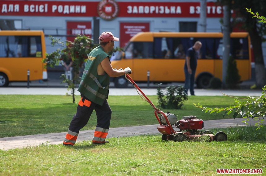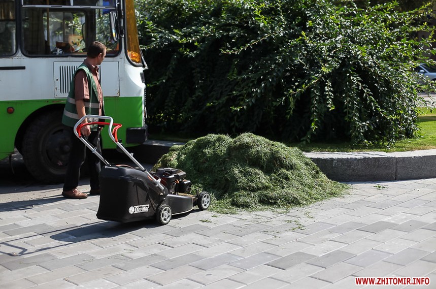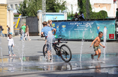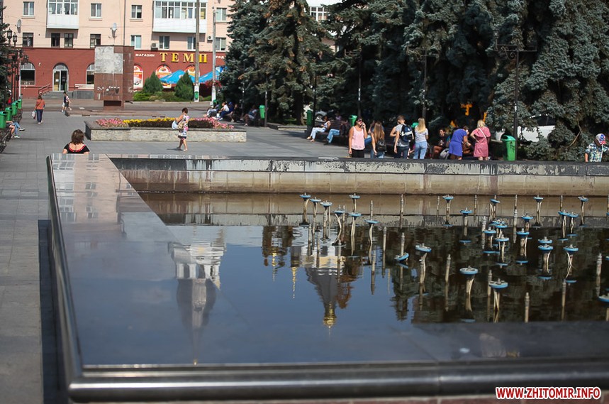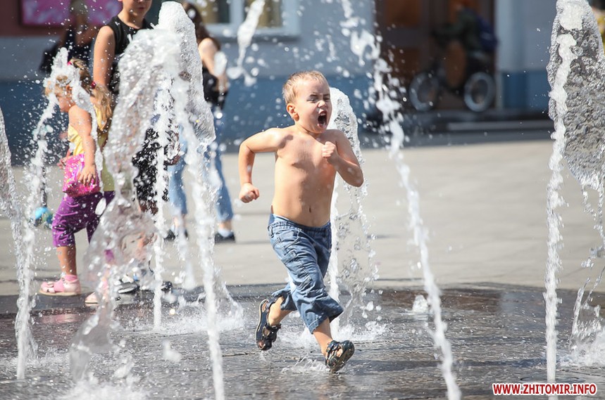 В останній літній день місто прибирають, поливають, стрижуть газони та ремонтують. Незважаючи на помірне тепло, можливістю освіжитися у фонтані на Михайлівській не нехтують навіть дорослі.