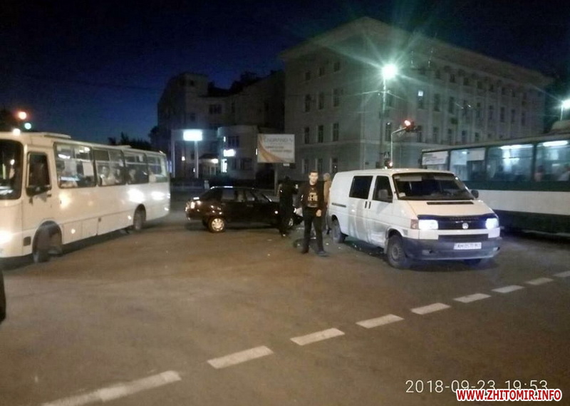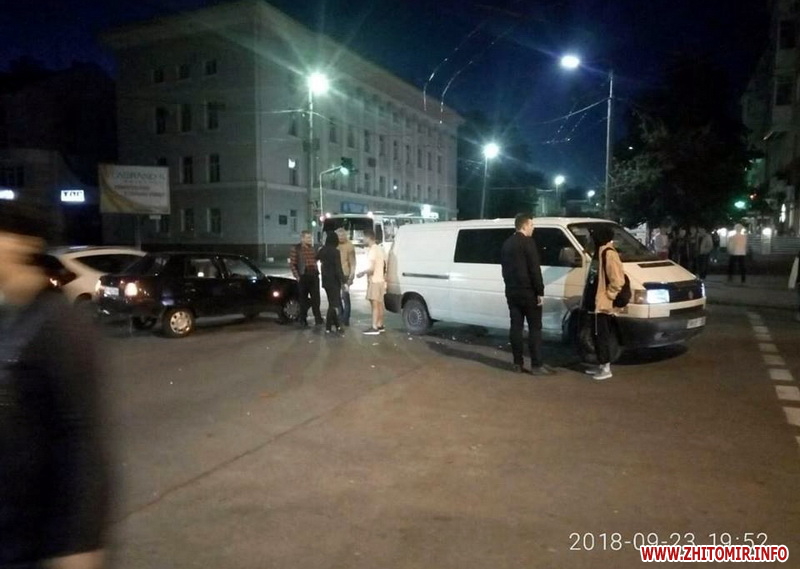 Недільного вечора, 23 вересня, на майдані Перемоги в Житомирі, біля будівлі з електронним годинником, зіштовхнулися автівки.