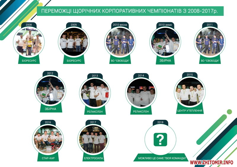 Пропонуємо приєднатися до єдиного в Житомирі заходу, де збирається бізнес-еліта міста - Корпоративний Чемпіонат з боулінгу. Він проводиться вже 12-раз, напередодні новорічних свят, тривалістю 1,5 місяці. Матчі розпочинаються 11 жовтня, а знижка 40% на тренування вже діє!