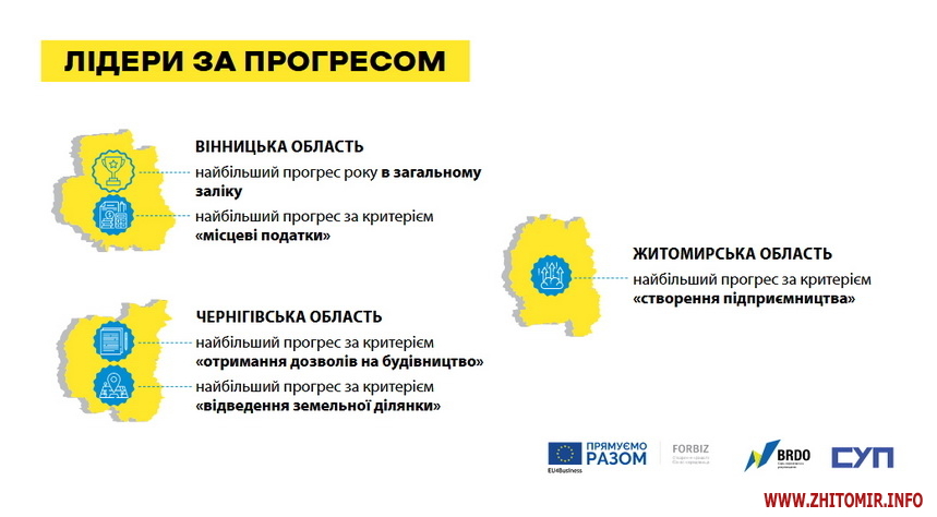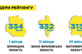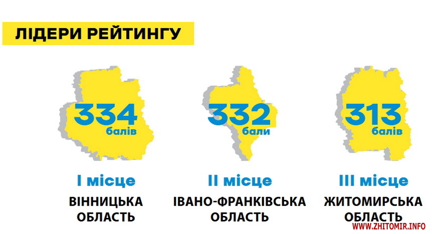 «Лідери набрали наступну кількість балів: Вінниччина – 334 бали, з невеликим відривом від неї Франківщина – 332 бали. І третє місце за Житомирщиною – 313 балів. Оцінювання проводилось за адаптованою методологією Світового банку на основі опитування вітчизняних підприємців. У фокусі дослідження 6 напрямків взаємодії підприємців із владою, а саме: створення підприємства, сплата місцевих податків; одержання дозволів на будівництво; оформлення земельної ділянки під об’єкт нерухомості; приєднання до електромережі, якість електронних сервісів», - йдеться у повідомленні.