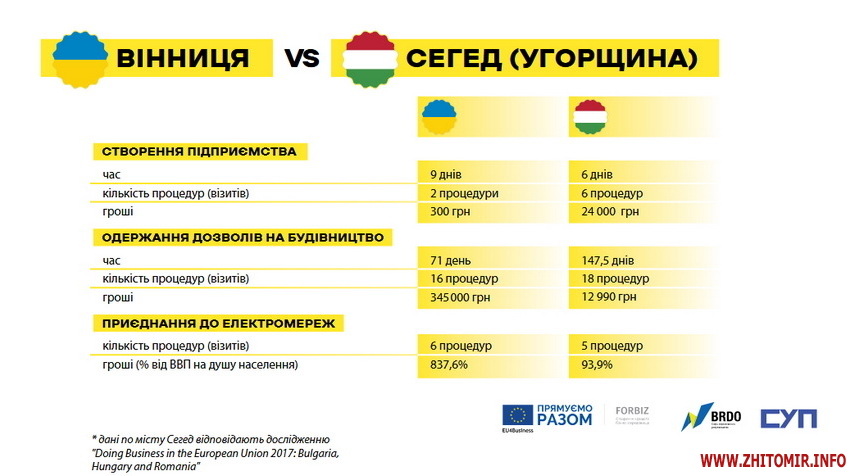Лідерів українського рейтингу порівняли з іншими містами світу – лідерами загального рейтингу Світового Банку DOING BUSINESS, і виявили неочікувані факти: щоб одержати дозвіл на будівництво, в Загребі (Хорватія) потрібно витратити 146 днів, в Алмати (Казахстан) – 123 дні, в Чернігові – лише 67 днів; створити підприємство в Кошице (Словаччина) можна за 19,5 днів, в Бразі (Португалія) – 6,5 днів, в Житомирі – 7 днів.