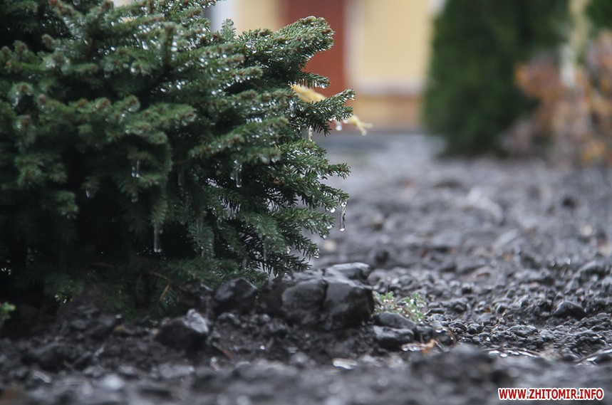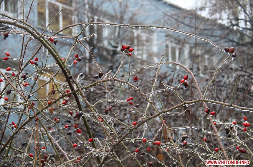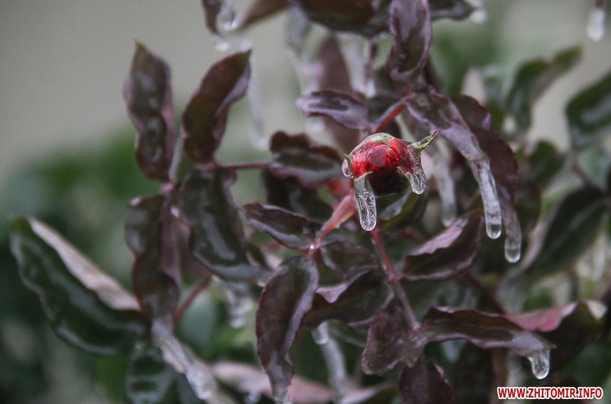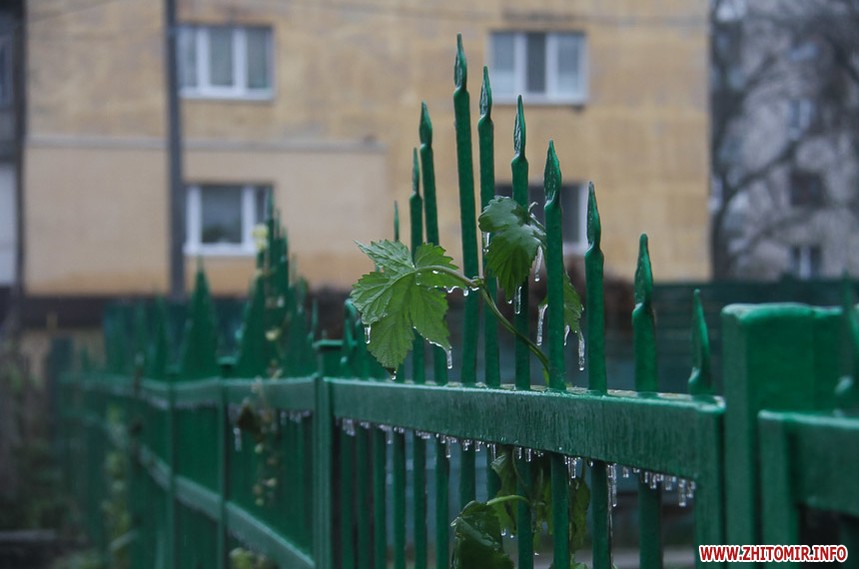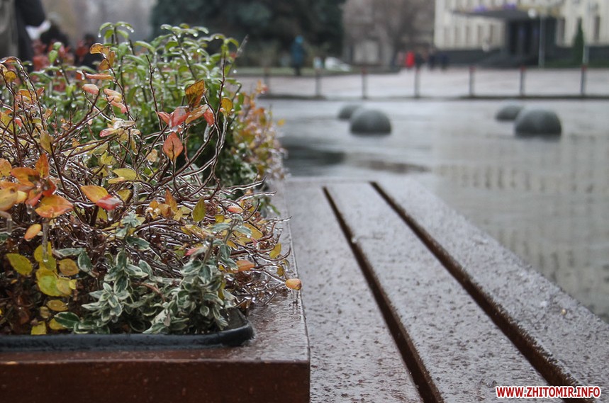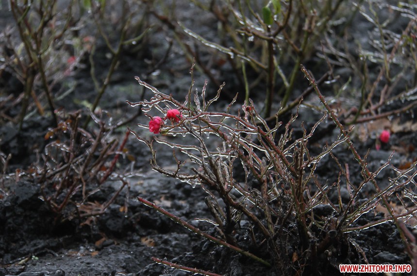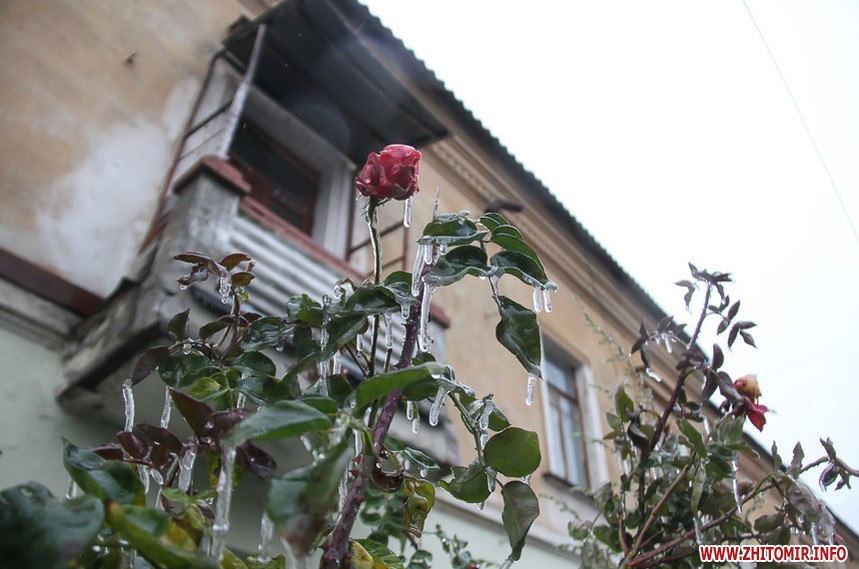 Дощ та невеликий мороз «заглазурували» місто: де-не-де видно маленькі бурульки і квіти, що покрилися прозорою, крижаною «сорочкою». До Житомира поступово наближається зима…