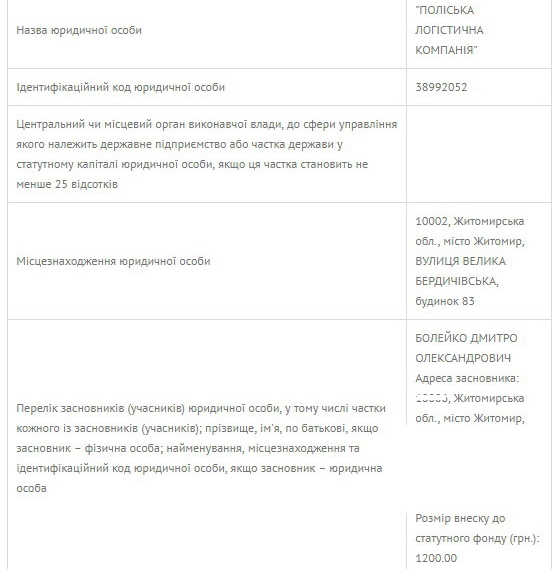 На ProZorro знаходимо всі три закупівлі, які проводив Романівський райвідділ освіти. Учасниками двох останніх були дві компанії – ПП «Моноліт» з юридичною адресою в Романові та фактичною – у селищі Любар Житомирської області, та ТОВ «Поліська логістична компанія» з реєстрацією в Житомирі, засновником та керівником якого з вересня 2018 року є екс-начальник управління капітального будівництва Житомирської міськради Дмитро Болейко: