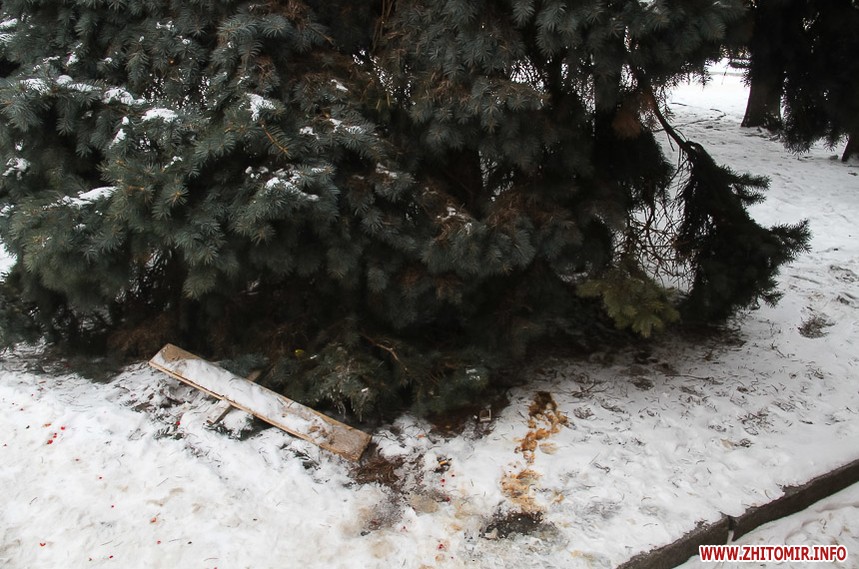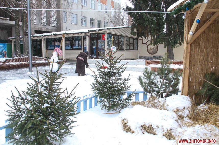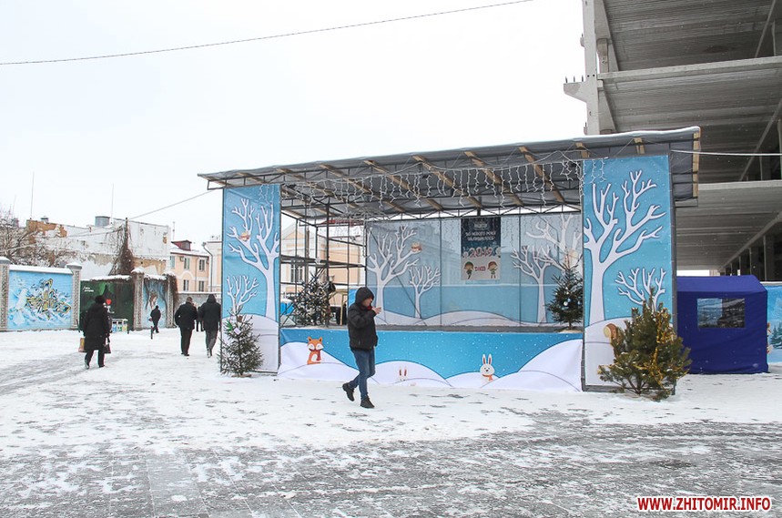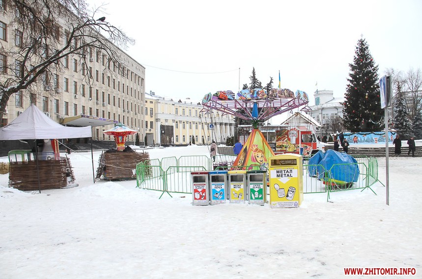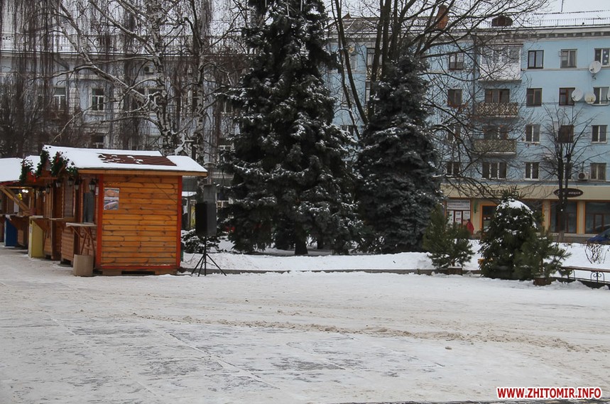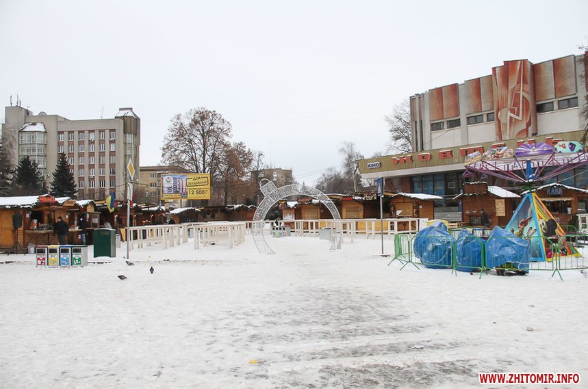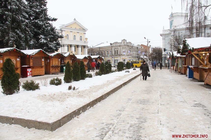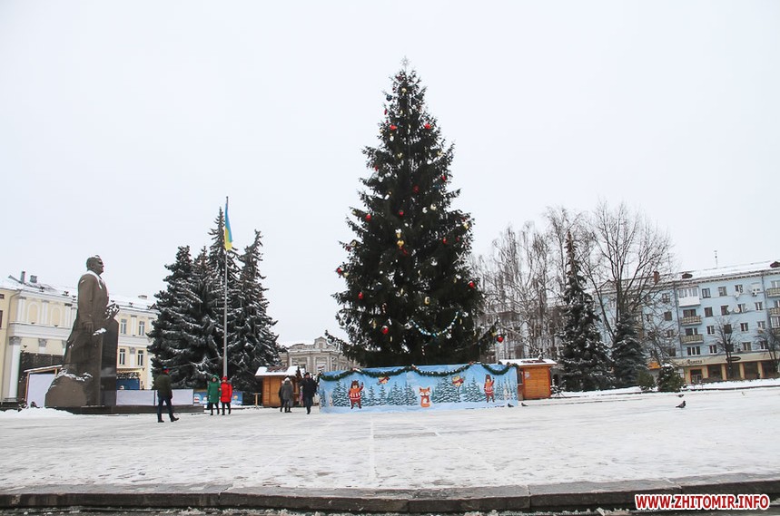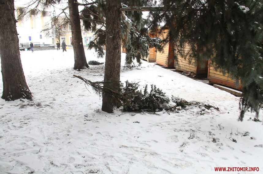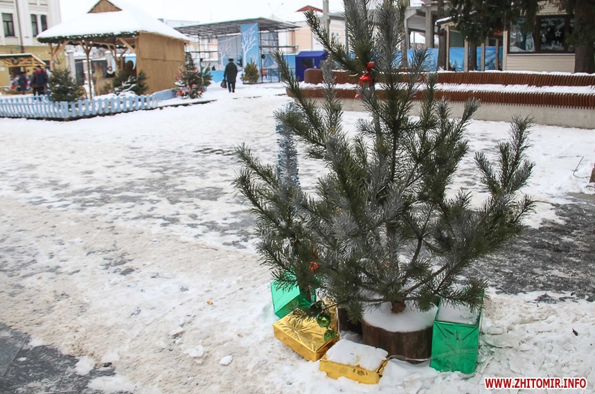 Головна житомирська ялинка ціла, як і будиночки на різдвяному ринку та декорації. Неушкоджений і будиночок Миколая, який завершив роботу 7 січня. Сміття немає ні під ногами, ні в урнах. На майдані активно працюють комунальники, з колонок лунають різдвяні мелодії.