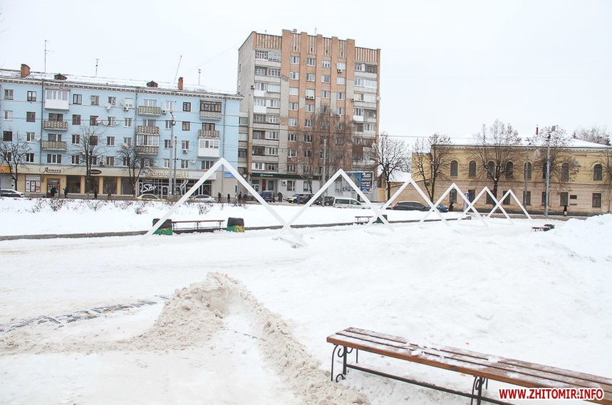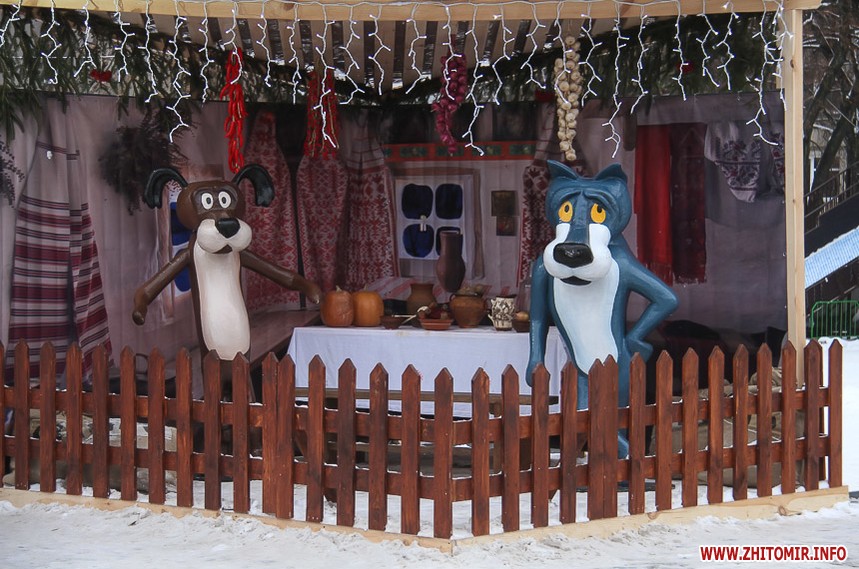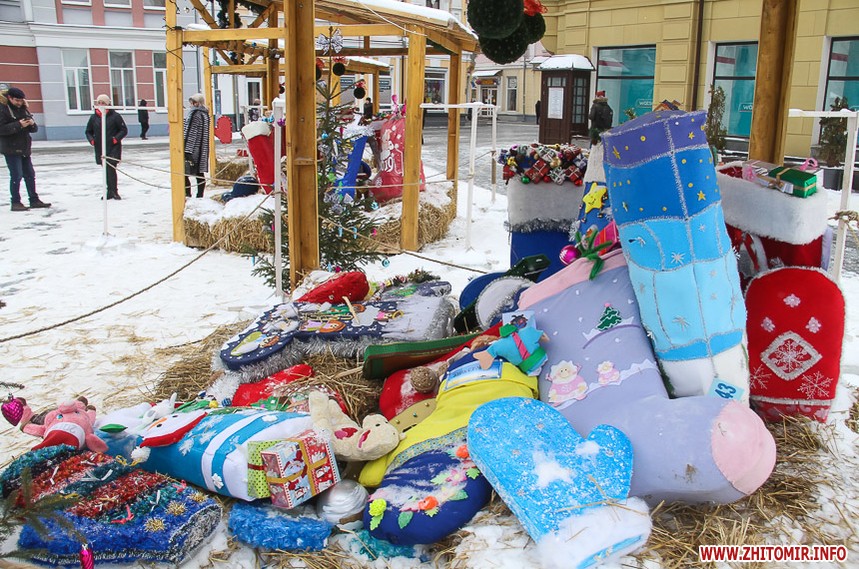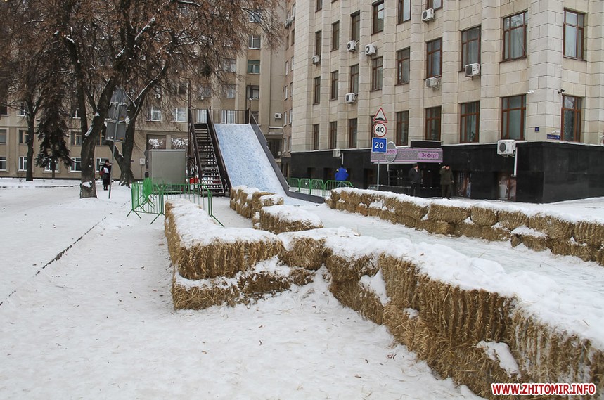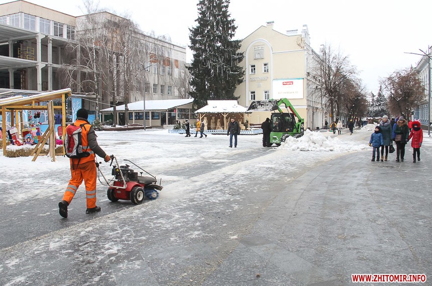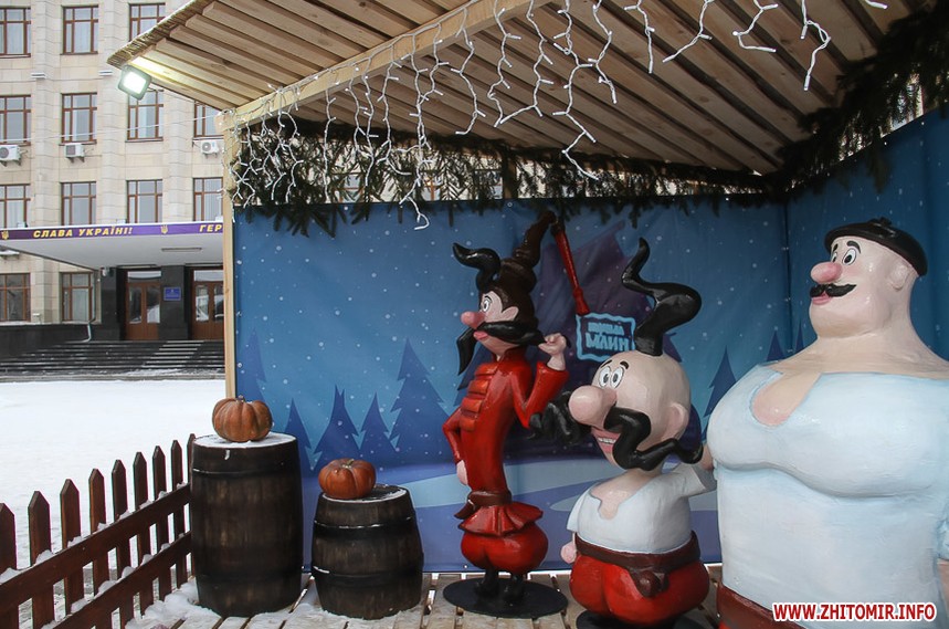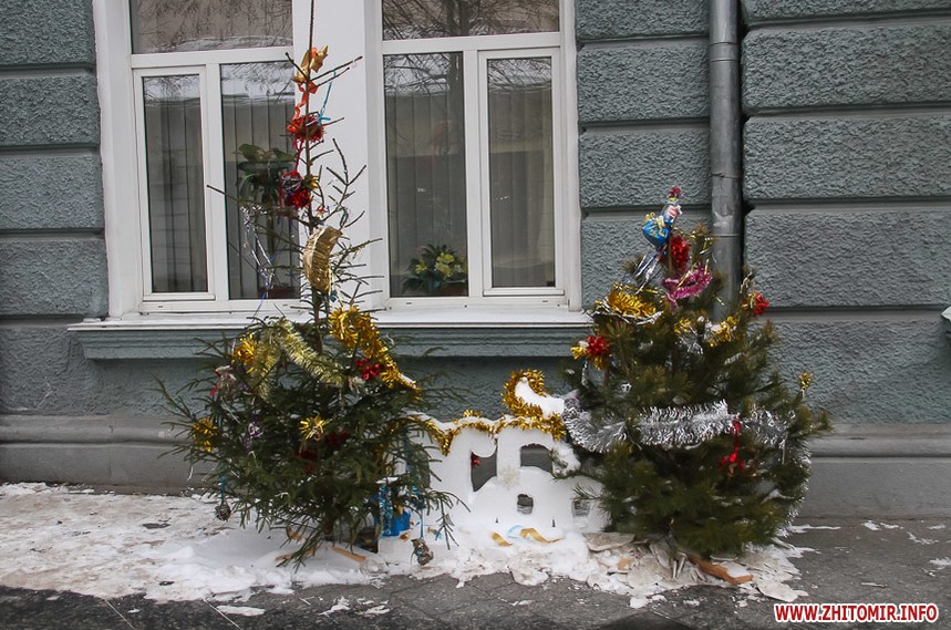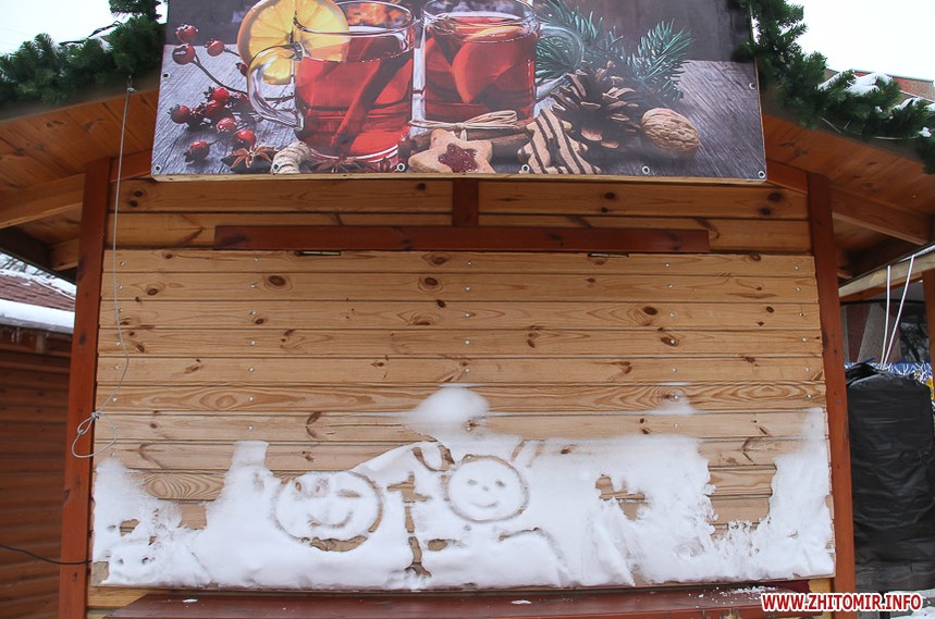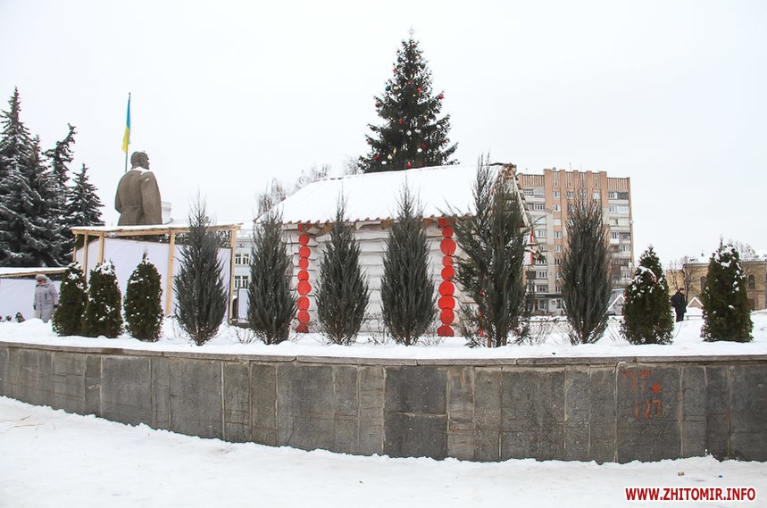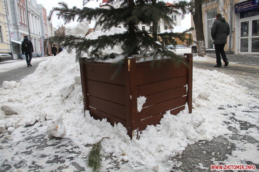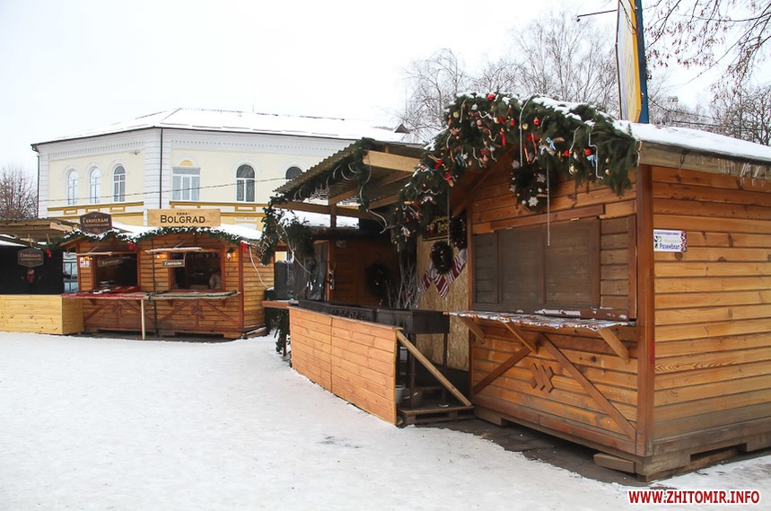 Головна житомирська ялинка ціла, як і будиночки на різдвяному ринку та декорації. Неушкоджений і будиночок Миколая, який завершив роботу 7 січня. Сміття немає ні під ногами, ні в урнах. На майдані активно працюють комунальники, з колонок лунають різдвяні мелодії.