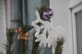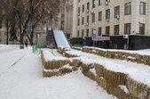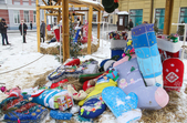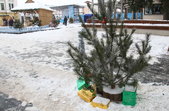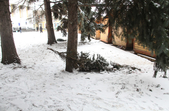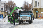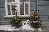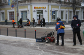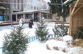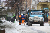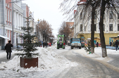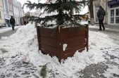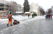 На пішохідній Михайлівській працює комунальна техніка, яка розчищає вулицю від снігу, та чоловік з ручною підмітальною машиною. На ялинках уздовж вулиці практично відсутні прикраси, частину яких– можливо, для зберігання – ще перед Новим роком зняли працівники міськради. Дерев’яні ящики під ялинками цілі, крім одного, в якому відбили край. Інсталяція з різдвяними панчохами «вижила», хоч рукавиці та панчохи тепер лежать пластом, а не стоять, як спочатку. Волхву з вертепу, який також вцілів, повісили «намисто» зі здобою.