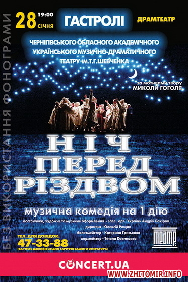 28 січня у Житомирському драмтеатрі в рамках гастролей Чернігівського обласного академічного українського музично-драматичного театру ім. Т. Г. Шевченка відбудеться вистава «Ніч перед Різдвом».